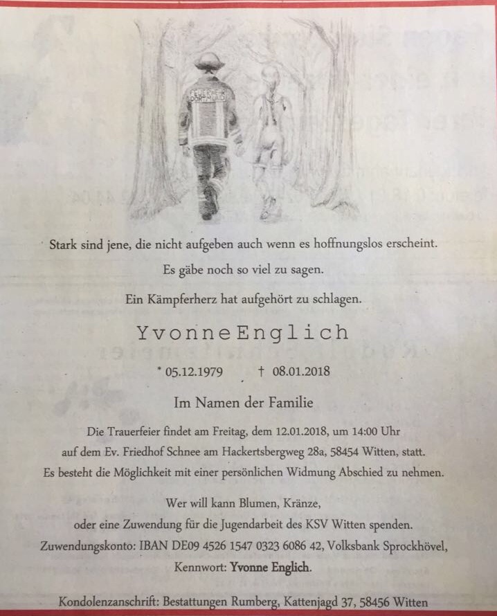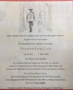 Die ehemalige Kaderringerin Yvonne Englich (u.a. Bronzemedaillengewinner bei der Frauen Europameisterschaft 2011 in Dortmund) ist im Alter von 38 Jahren leider viel zu früh gestorben.