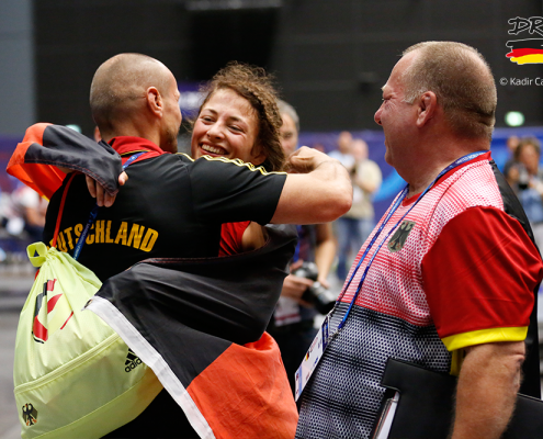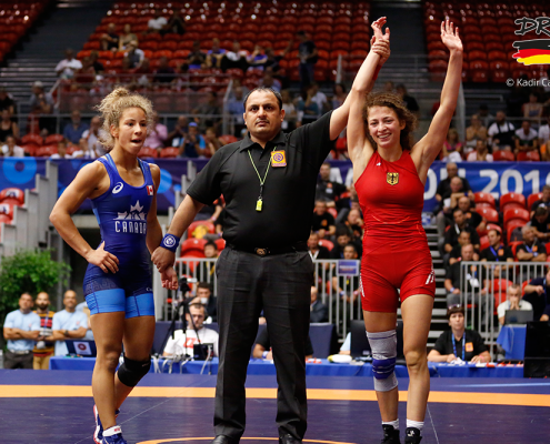Am Abend kam es dann zum Aufeinandertreffen mit der starken Kanadierin Kristina McLaren. Nach einer ausgeglichenen ersten Hälfte, ging die Nordamerikanerin im zweiten Durchgang mit 4:2 in Front. Nach viereinhalb absolvierten Minuten machten sich erste konditionelle Probleme bei McLaren bemerkbar und die Deutsche Ecke trieb Elena fortan vehement an. Gute 40 Sekunden vor dem Gong zog sie dann eine tolle Schleuder aus der Armklammer und wurde mit 4 Punkten und somit der 6:4 Führung belohnt. Die verbleibende halbe Minute brachte Brugger routiniert zu Ende und feierte ihre zweite Medaille im Jahr 2016.