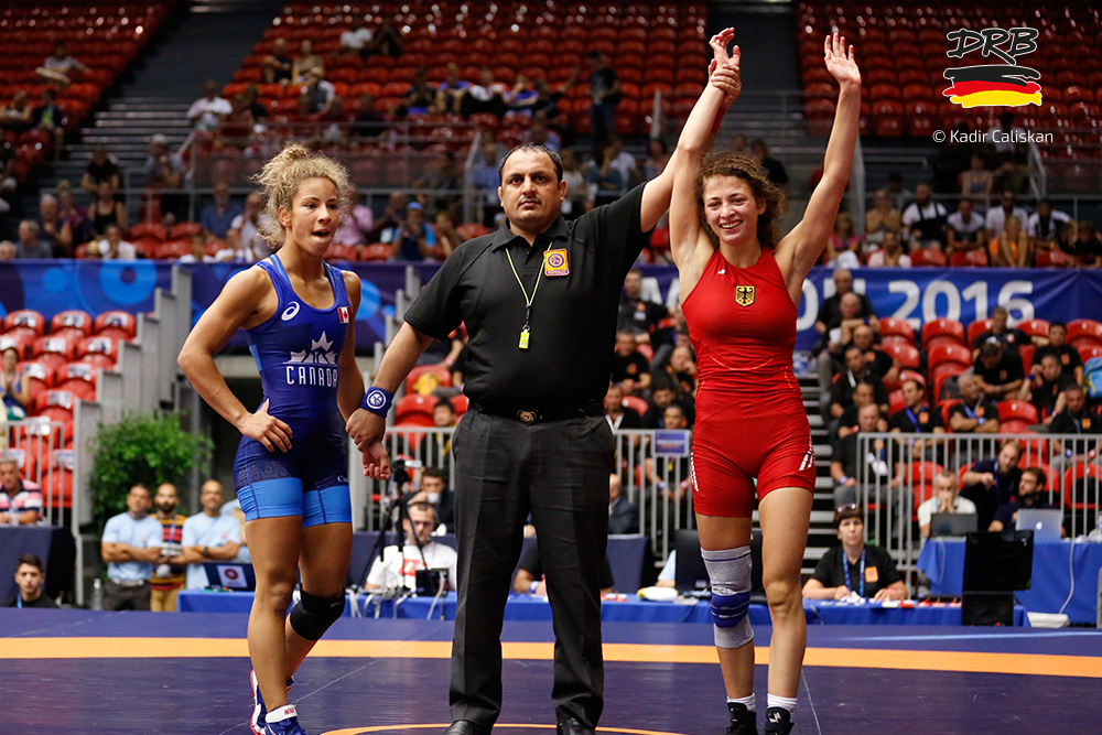 Am Abend kam es dann zum Aufeinandertreffen mit der starken Kanadierin Kristina McLaren. Nach einer ausgeglichenen ersten Hälfte, ging die Nordamerikanerin im zweiten Durchgang mit 4:2 in Front. Nach viereinhalb absolvierten Minuten machten sich erste konditionelle Probleme bei McLaren bemerkbar und die Deutsche Ecke trieb Elena fortan vehement an. Gute 40 Sekunden vor dem Gong zog sie dann eine tolle Schleuder aus der Armklammer und wurde mit 4 Punkten und somit der 6:4 Führung belohnt. Die verbleibende halbe Minute brachte Brugger routiniert zu Ende und feierte ihre zweite Medaille im Jahr 2016.