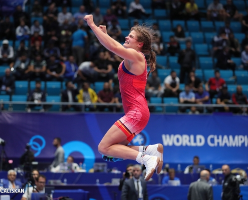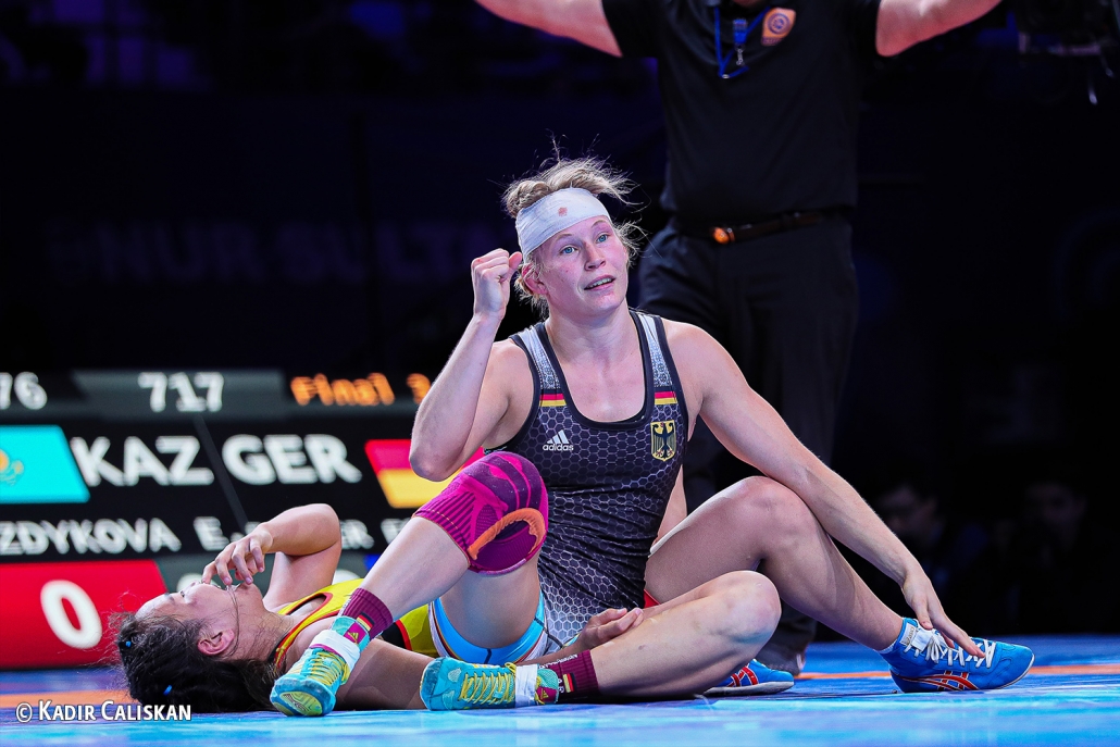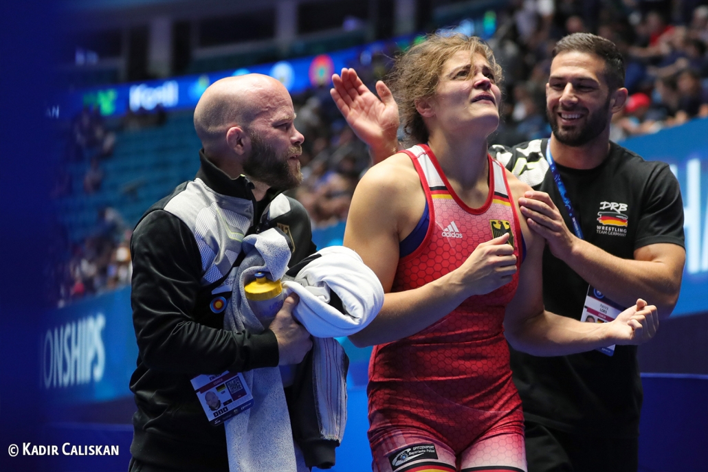 Dritte Bronzemedaille für den DRB Nachdem Aline Rotter Focken 2018 erstmals nach drei aufeinanderfolgenden Weltmeisterschaften ohne Medaille blieb, bewies die Krefelderin, dass Budapest nur ein Ausrutscher war. Mit einer starken Performance und 3 souveränen Siegen kämpfte sich die an Nummer 3 gesetzte Deutsche bis ins Halbfinale vor und hatte somit bereits die Quali in der Tasche. Im Halbfinale unterlag sie in einem spannenden Duell der alten und neuen Weltmeisterin Adeline Gray (USA) knapp nach Punkten. Somit ging es heute Nachmittag gegen die Kasachin Syzdykova um Bronze. Die Bronzemedaille Gewinnerin der olympischen Spiele von Rio tat sich schwer ein Mittel gegen die Deutsche zu finden und versuchte es mehr und mehr über eine sehr harte Gangart. Die früh durch einen Cut gezeichnete Focken blieb jedoch konzentriert und jederzeit Chef im Ring. Nach einer Aktivitätszeit für die Kasachin drang Aline ihre Kontrahentin mit einem Angriff von der Matte. Da die Challenge der roten Ecke erfolglos blieb, lag die Deutsche komfortabel mit 3:0 vorne. Auch im zweiten Abschnitt konnte Syzdykova keinen einzigen Angriff ansetzen und so feierte Aline hochverdient ihre vierte WM-Medaille. Zum Start der Freistil Wettbewerbe lief es durchwachsen für das deutsche Team.