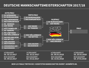 Leipzig – Die Favoriten haben sich im Viertelfinale der DRB-Bundesliga durchgesetzt, der SV Wacker Burghausen, KSV Köllerbach, ASV Mainz und TuS Adelhausen kämpften sich einem Abend vor Heiligabend ins Halbfinale der laufenden Meisterschaftsserie.