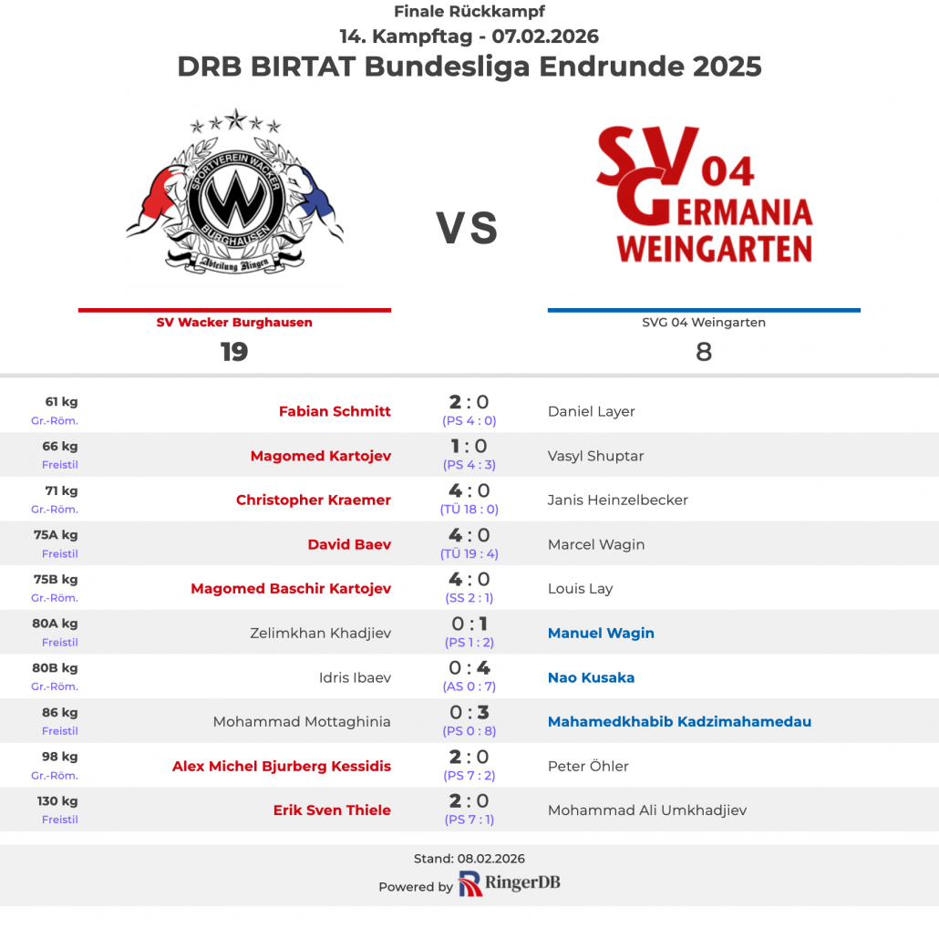 Den Auftakt machte der frühere EM-Dritte Fabian Schmitt in der Gewichtsklasse bis 61 kg Greco-Roman. Mit einem souveränen 4:0-Punktesieg gegen Daniel Layer brachte er Burghausen früh auf die Siegerstraße. Besonders emotional wurde es nach dem Abpfiff: Fabian Schmitt zog seine Ringerschuhe auf der Matte aus und beendete damit offiziell seine erfolgreiche Karriere.