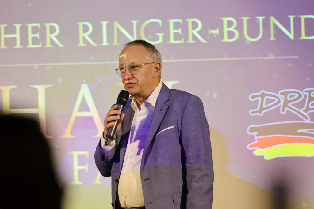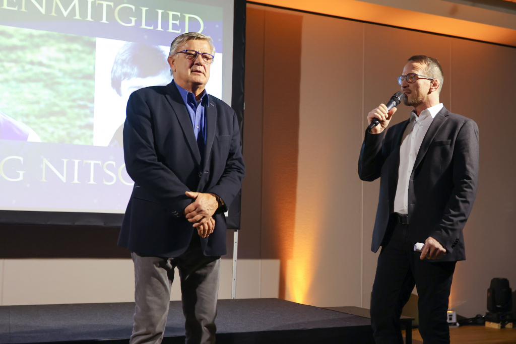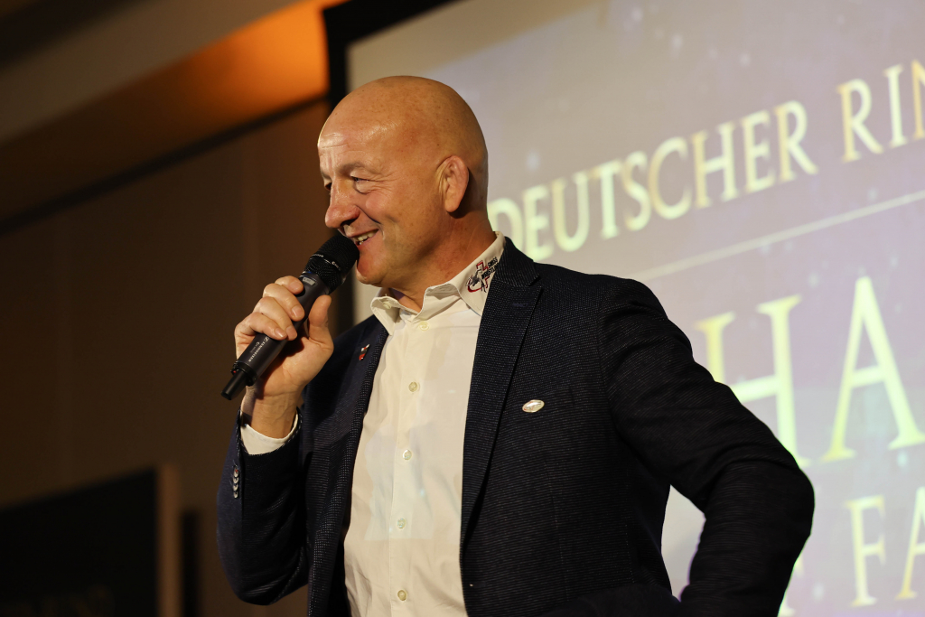 Der DRB präsentierte seine Vergangenheit, ehrte ihre Heldinnen und Helden und ließ längst zum Erliegen gebrachte Beziehungen am Beispiel von Wolfgang Nitschke erfolgreich aufleben. Auf Initiative von Klaus Angermann, der deutschen Reporterstimme des Ringens, stimmten sowohl das Präsidium als auch die Delegierten vormittags die Ernennung Nitschkes zum DRB-Ehrenmitglied einstimmig ab. Nitschke selbst war zur Abendveranstaltung eingeladen, wusste aber von der Ehre, die im zu Teil werden sollte, von nichts. Erst als sein früherer Schützling Alexander Leipold und Moderator Thomas Eigenbrodt den Übergang einleiteten, war es auch für den Leipziger Ex-Bundestrainer und Sportdirektor zu erahnen, was ihm widerfährt. „Ich war sehr überrascht. Ich bin mit gemischten Gefühlen zu dieser Veranstaltung gekommen. Aus der Vergangenheit heraus, war es für mich nicht einfach. Als ich meinen Namen gehört habe und die zehn Meter bis zur Bühne vorlegte, habe ich 17 Jahre Distanz gegenüber dem DRB überwunden. Trotz meiner Zuneigung und Hingabe zum deutschen Ringkampfsport gab es in der Vergangenheit sehr viele Differenzen. Das ist alles in den paar Minuten in mir vorgegangen. Ich freue mich aber jetzt, dass ich in diesen Kreis mit aufgenommen bin und dass meine Arbeit so geehrt wurde“.