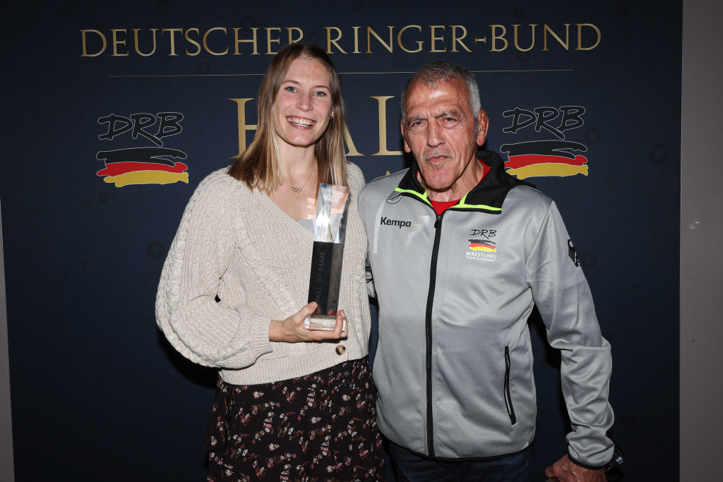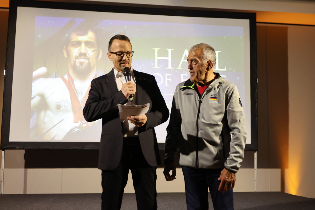Nach der dreistündigen Sitzung am Vormittag füllte sich das H4-Tagungshotel mit zahlreichen Welt- und Europameistern sowie Medaillengewinnern bei olympischen Spielen. 50 Jahre Deutscher Ringer-Bund, verbunden mit der erstmaligen Präsentation der „Hall of Fame“ lockten Legenden wie Adolf Seger, Pasquale Passarelli, Rifat Yildiz, Thomas Zander, Mirko Englich und Heinz Ostermann in den feierlich geschmückten Tagungssaal nach Leipzig. Auch die ehemaligen DDR-Legenden u.a. Olympiamedaillengewinner Heinz-Helmut Wehling, Dieter Brüchert, Andreas Schröder und Horst Stottmeister waren in Leipzig zu sehen. Unter den rund 100 Ehrengästen mischten sich die Generationen der Vergangenheit mit der Gegenwart. Den ersten acht Legenden wurde die wohl größte Ehre des DRBs zuteil. In einer sehr niveauvollen Zeremonie mit ausgewählten Laudatoren wurden Adolf Seger, Aline Rotter-Focken, Georg Metzler †, Heinz Ostermann, Lothar Metz †, Rudolph Vesper, Uwe Neupert und Wilfried Dietrich † in die „Hall of Fame“ des Deutschen Ringer-Bundes aufgenommen.