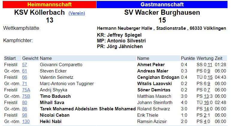 Dann war mit dem Gewinnen wieder der KSV Köllerbach an der Reihe. In der Freistil-Klasse bis 98 kg zeigte der KSV-Rumäne Nicolai Ceban dem zweifachen deutschen Meister Erik Thiele seine Grenzen auf. Ceban brachte geschickt einen 2:1-Punktsieg über die Zeit. In der Klasse bis 66 kg war der Köllerbacher Freistil-Spezialist Valentin Seimetz gegen den dreifachen türkischen Europameister Cengizhan Erdogan chancenlos. Als der Ringer des SV Wacker Burghausen erfolgreich seine Beinschraube ansetzen konnte, war es um Seimetz geschehen. Cengizhan Erdogan siegte mit 15:0 dank technischer Überlegenheit. Das hatte einen Halbzeitstand von 11:3 für Burghausen zur Folge.