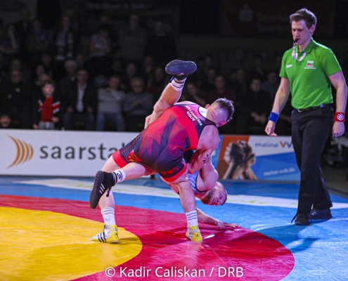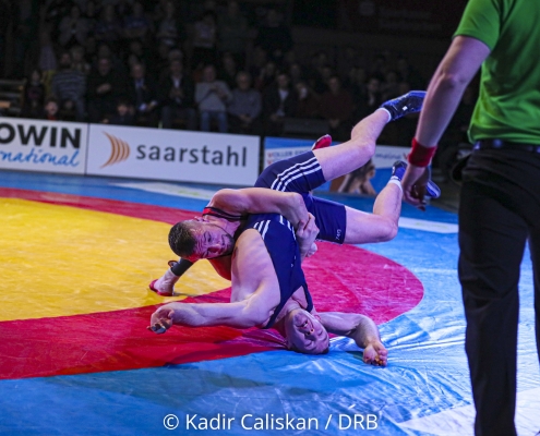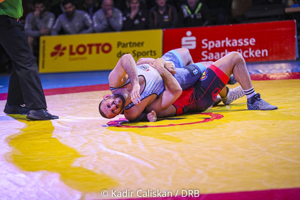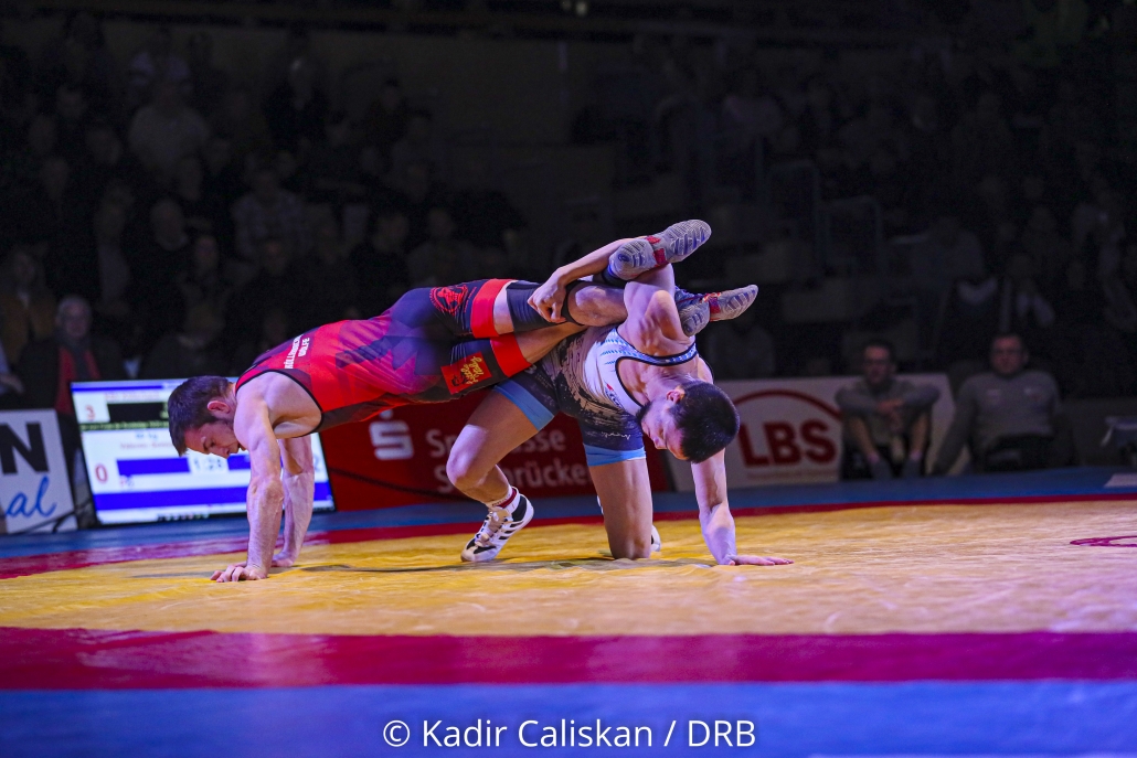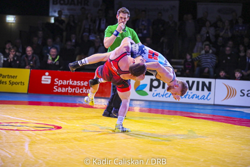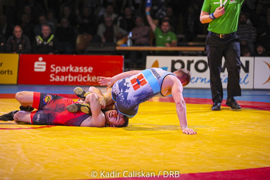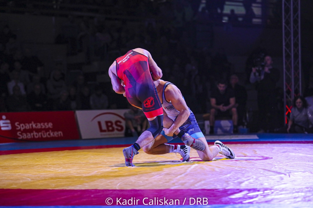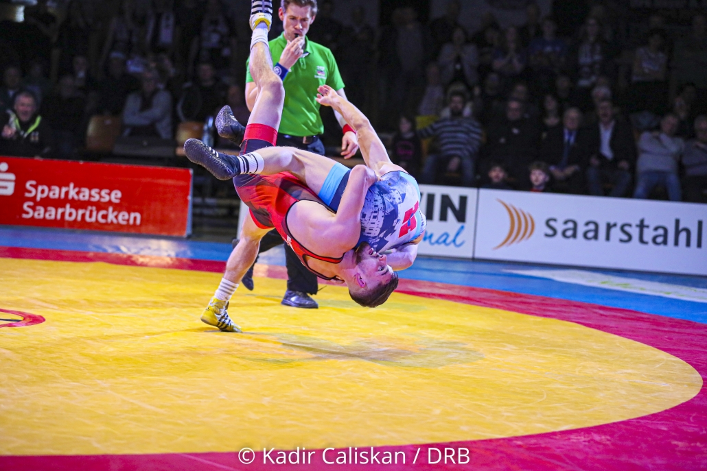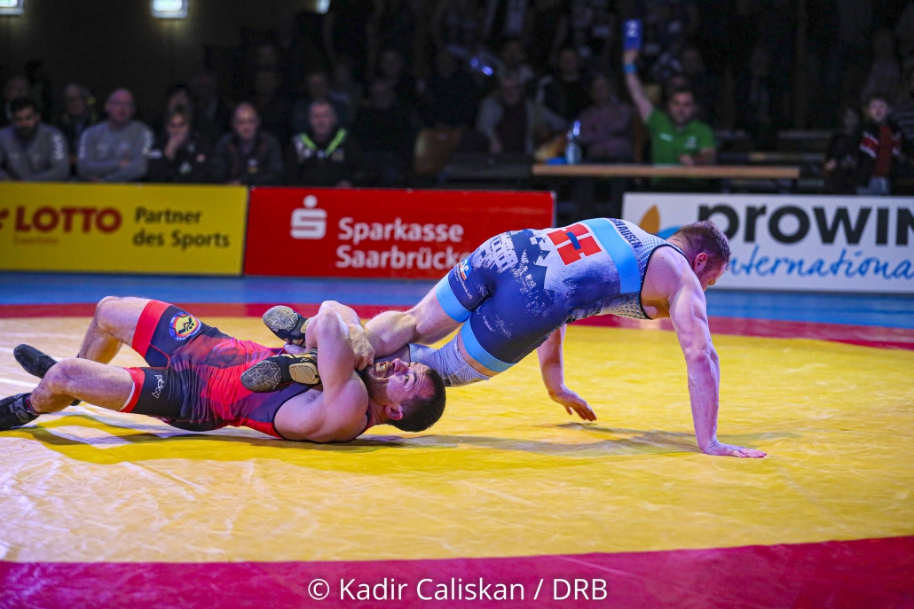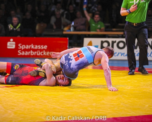 Danach kam es in der 75 kg Klasse A zum mit großer Spannung erwarteten Freistil-Duell zwischen dem amtierenden deutschen Meister Andrij Shyyka und dem dreifachen türkischen Europameister Söner Demirtas. Der 39 Jahre Köllerbacher Kult-Ringer kämpfte wie ein Löwe, doch gegen den wirklich starken Demirtas war an diesem Abend kein Kraut gewachsen. Der Türke in den Diensten des SV Wacker Burghausen gewann mit 7:0 nach Punkten. Dann brandete wieder Jubel bei den KSV-Fans auf, als in der Klasse bis 75 kg B Greco-Spezialist und Publikumsliebling Timo Badusch zum Kampf gegen den dreifachen deutschen Meister Matthias Maasch antrat. Der saarländische Polizeikommissar lieferte wieder einmal einen großen Kampf ab. Und mit Aushebern und Überwürfen geizte er auch dieses Mal nicht. Nach den vollen sechs Kampfminuten verbuchte das Kampfgericht einen klaren 13:3-Punktsieg für den souveränen KSV-Kapitän.