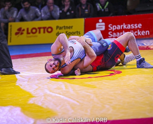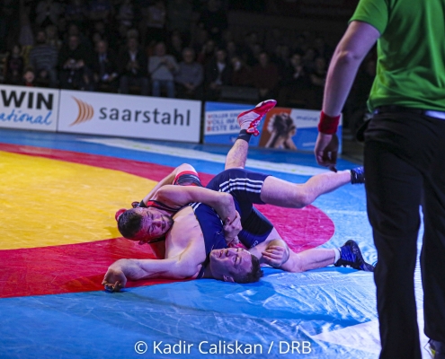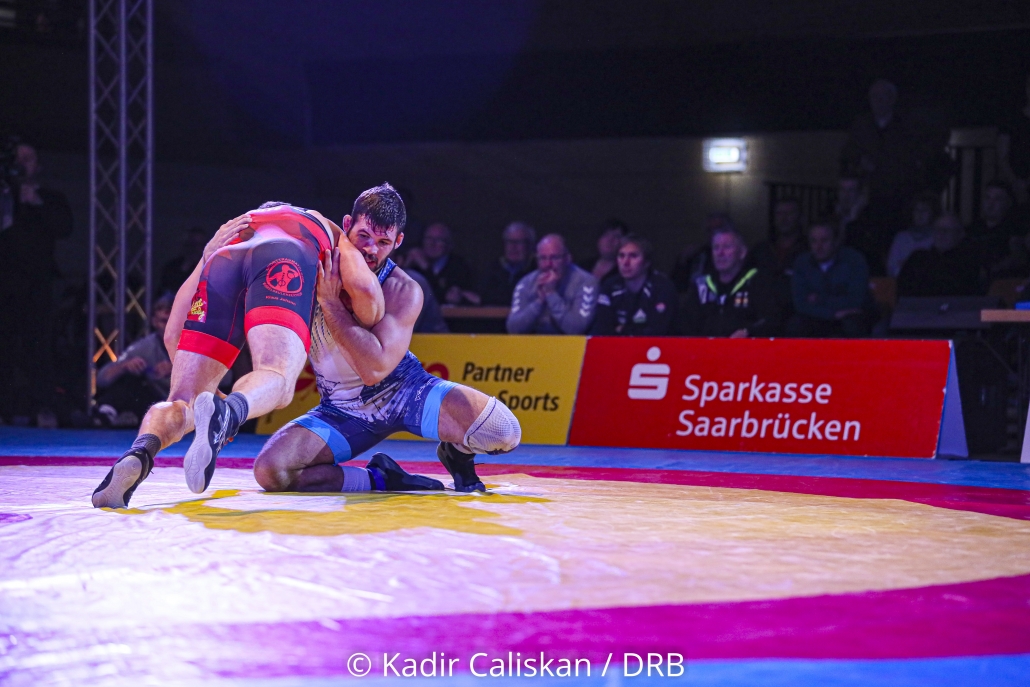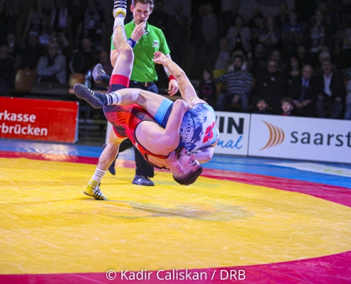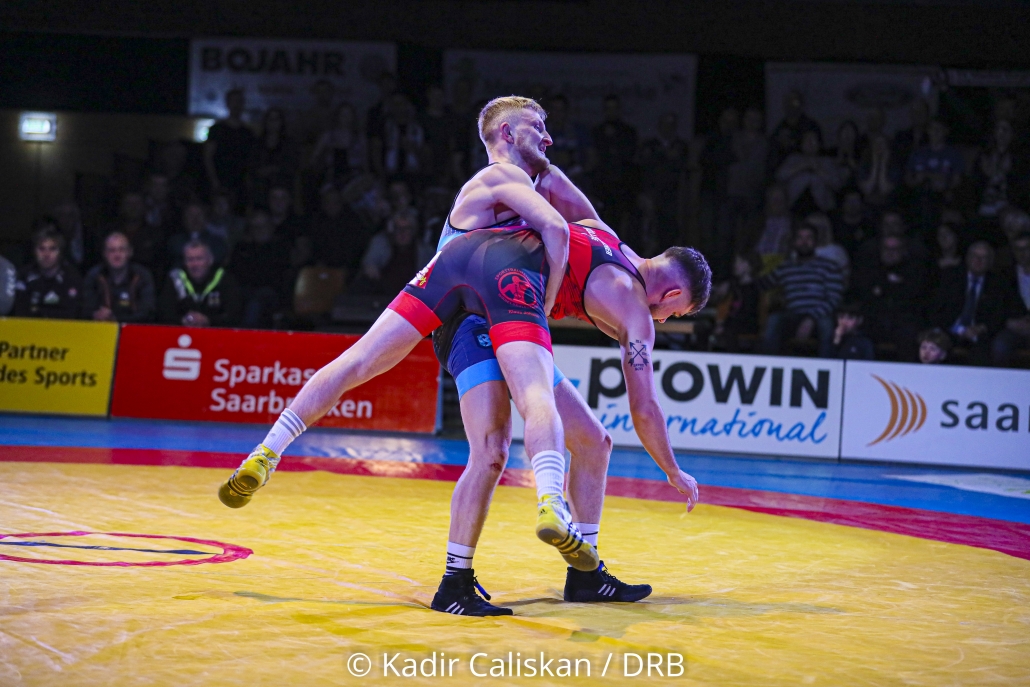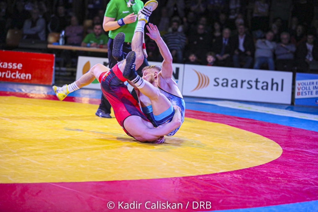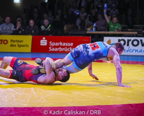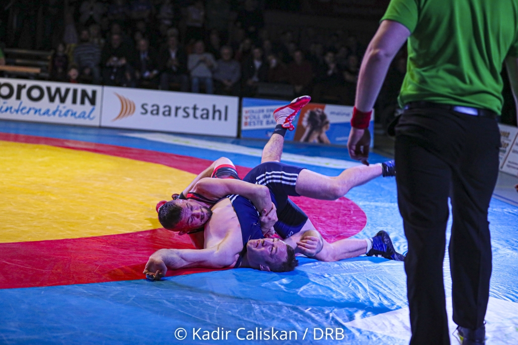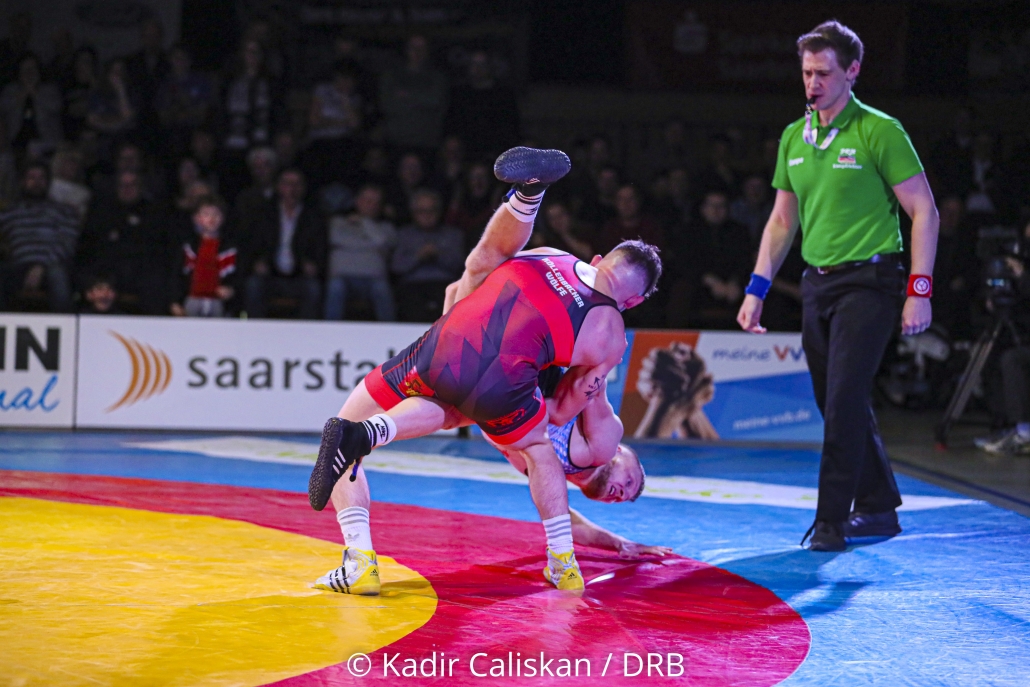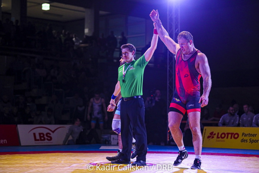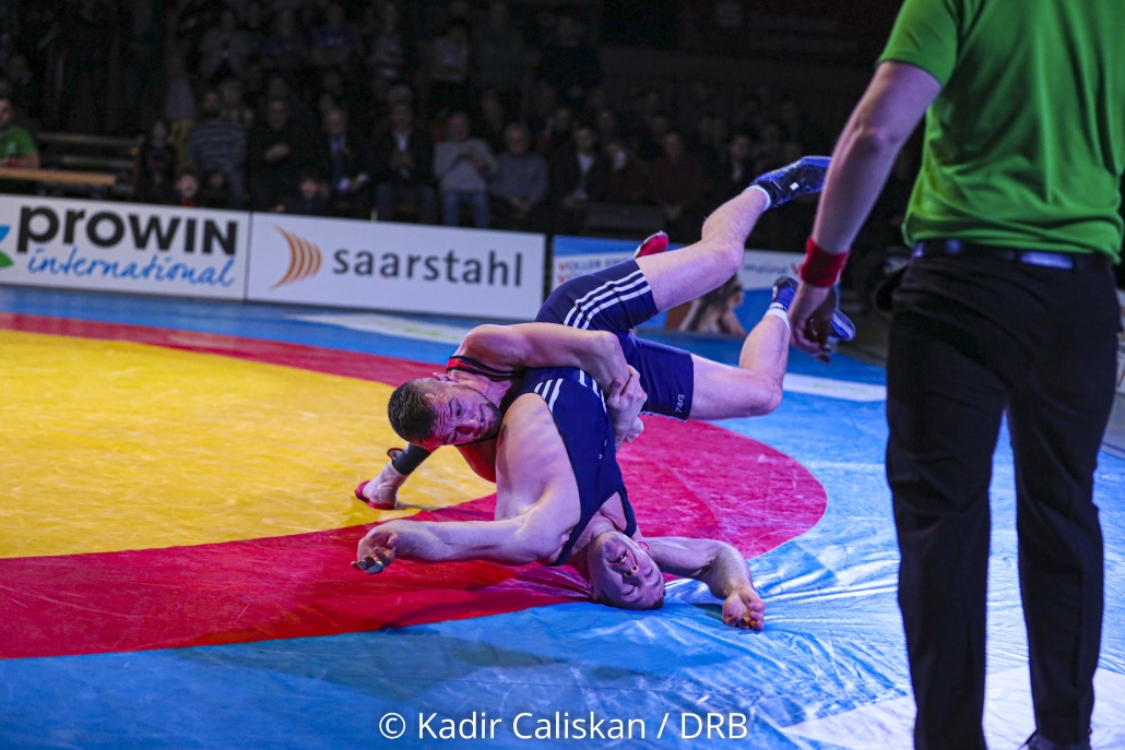 Danach kam es in der 75 kg Klasse A zum mit großer Spannung erwarteten Freistil-Duell zwischen dem amtierenden deutschen Meister Andrij Shyyka und dem dreifachen türkischen Europameister Söner Demirtas. Der 39 Jahre Köllerbacher Kult-Ringer kämpfte wie ein Löwe, doch gegen den wirklich starken Demirtas war an diesem Abend kein Kraut gewachsen. Der Türke in den Diensten des SV Wacker Burghausen gewann mit 7:0 nach Punkten. Dann brandete wieder Jubel bei den KSV-Fans auf, als in der Klasse bis 75 kg B Greco-Spezialist und Publikumsliebling Timo Badusch zum Kampf gegen den dreifachen deutschen Meister Matthias Maasch antrat. Der saarländische Polizeikommissar lieferte wieder einmal einen großen Kampf ab. Und mit Aushebern und Überwürfen geizte er auch dieses Mal nicht. Nach den vollen sechs Kampfminuten verbuchte das Kampfgericht einen klaren 13:3-Punktsieg für den souveränen KSV-Kapitän.
