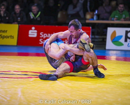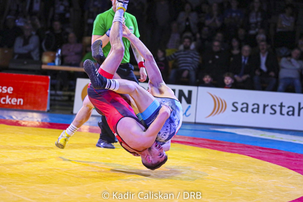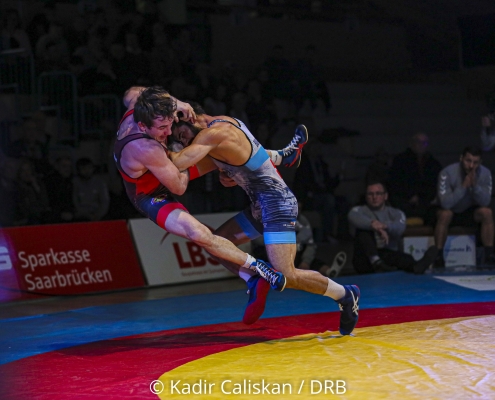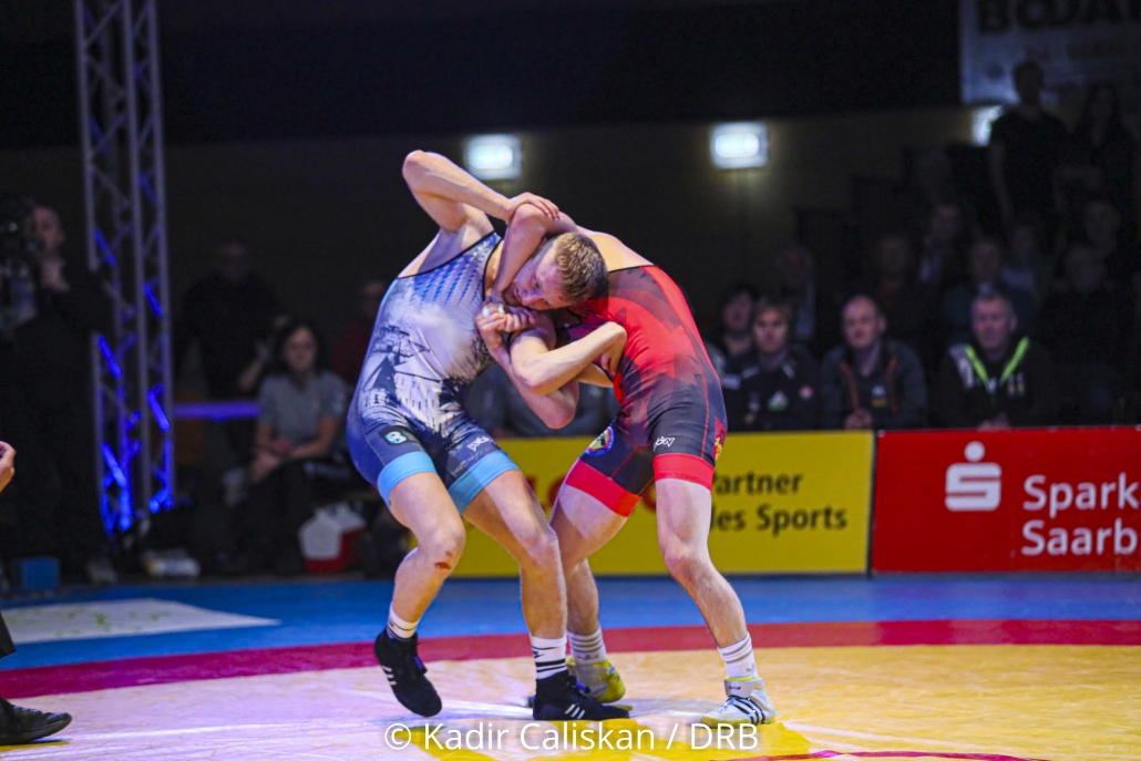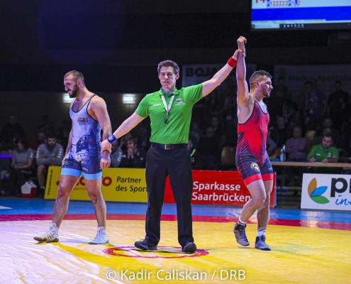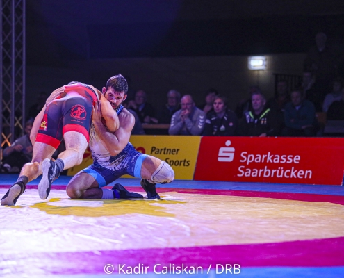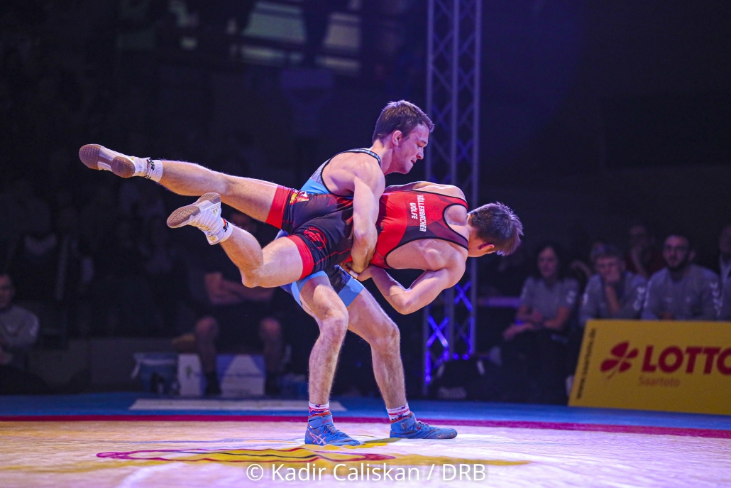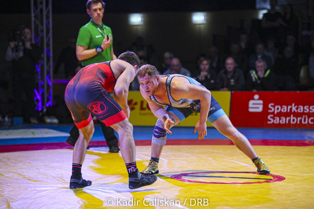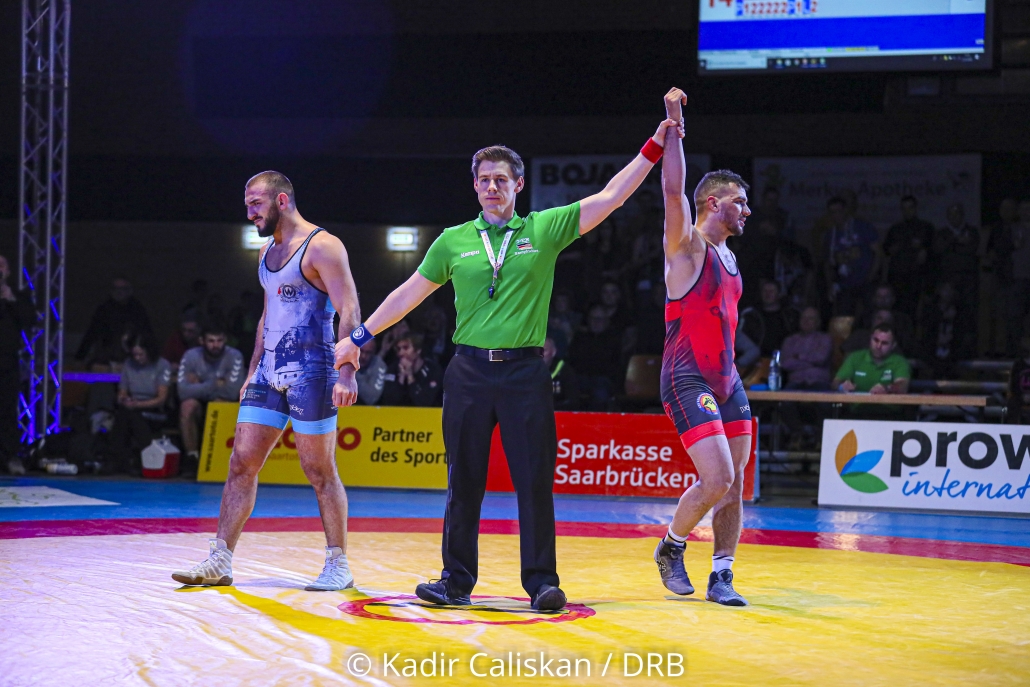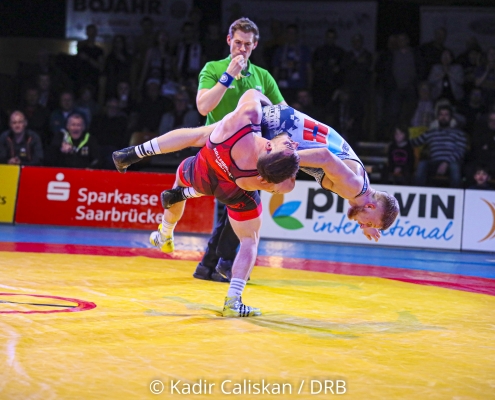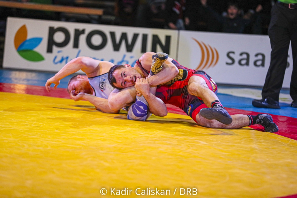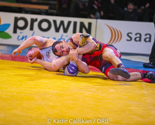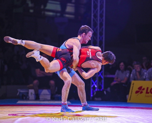Danach kam es in der 75 kg Klasse A zum mit großer Spannung erwarteten Freistil-Duell zwischen dem amtierenden deutschen Meister Andrij Shyyka und dem dreifachen türkischen Europameister Söner Demirtas. Der 39 Jahre Köllerbacher Kult-Ringer kämpfte wie ein Löwe, doch gegen den wirklich starken Demirtas war an diesem Abend kein Kraut gewachsen. Der Türke in den Diensten des SV Wacker Burghausen gewann mit 7:0 nach Punkten. Dann brandete wieder Jubel bei den KSV-Fans auf, als in der Klasse bis 75 kg B Greco-Spezialist und Publikumsliebling Timo Badusch zum Kampf gegen den dreifachen deutschen Meister Matthias Maasch antrat. Der saarländische Polizeikommissar lieferte wieder einmal einen großen Kampf ab. Und mit Aushebern und Überwürfen geizte er auch dieses Mal nicht. Nach den vollen sechs Kampfminuten verbuchte das Kampfgericht einen klaren 13:3-Punktsieg für den souveränen KSV-Kapitän.