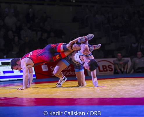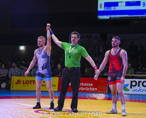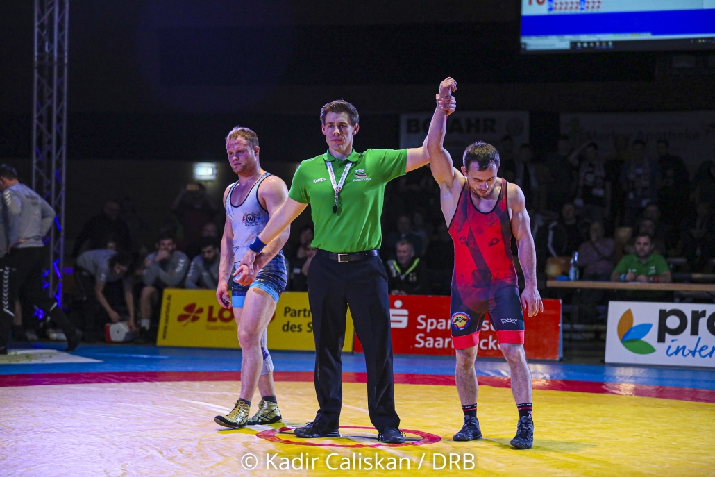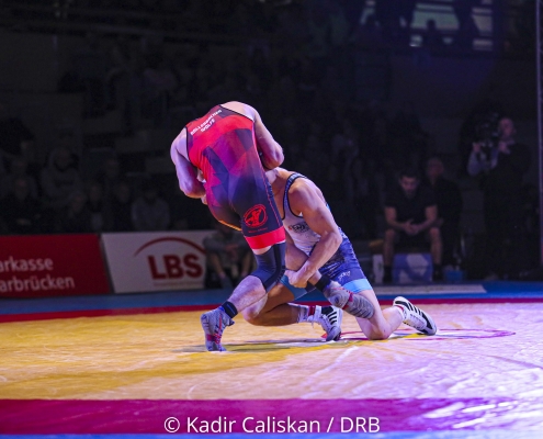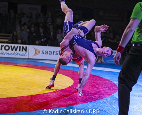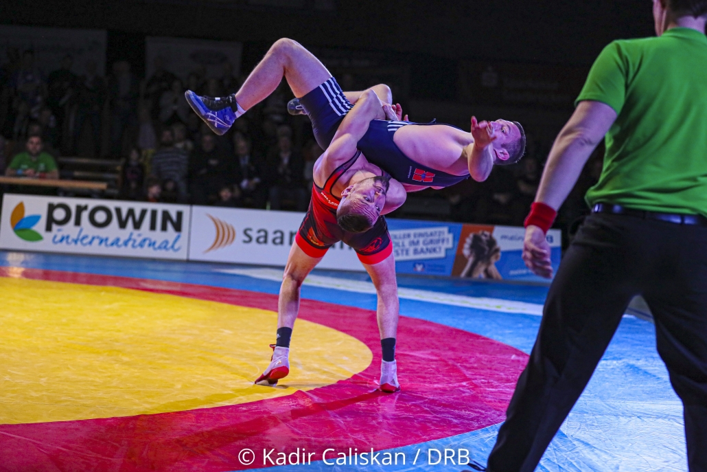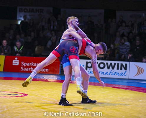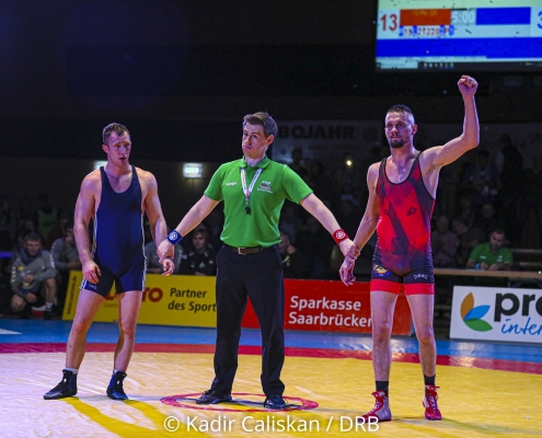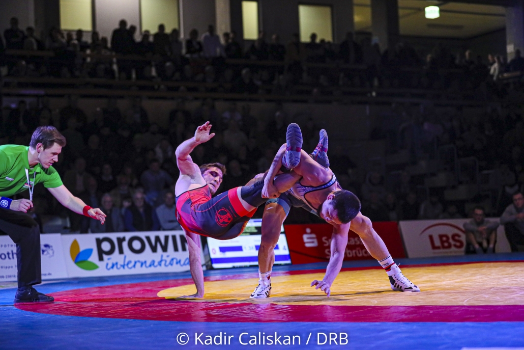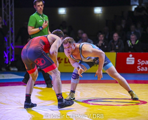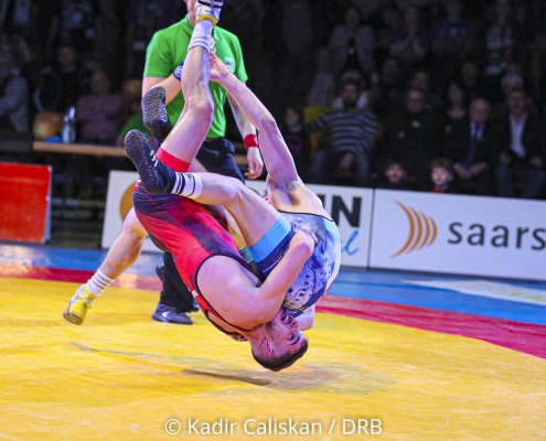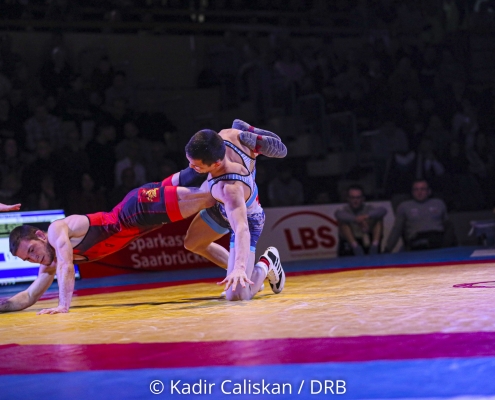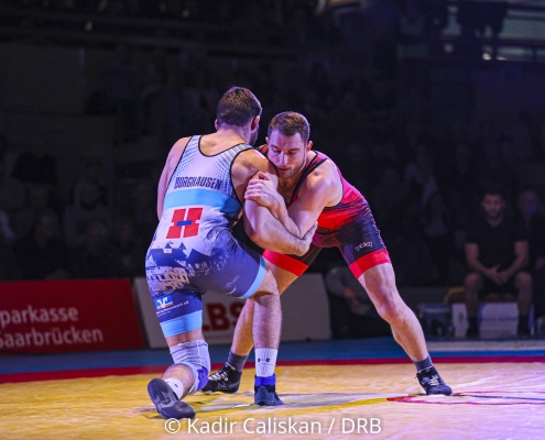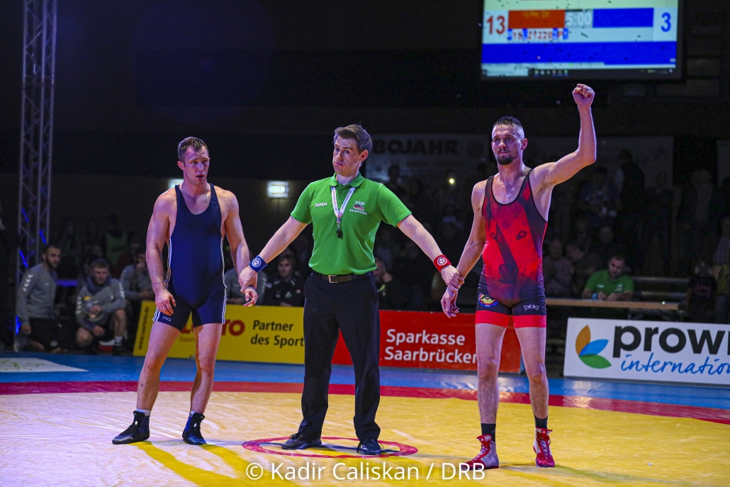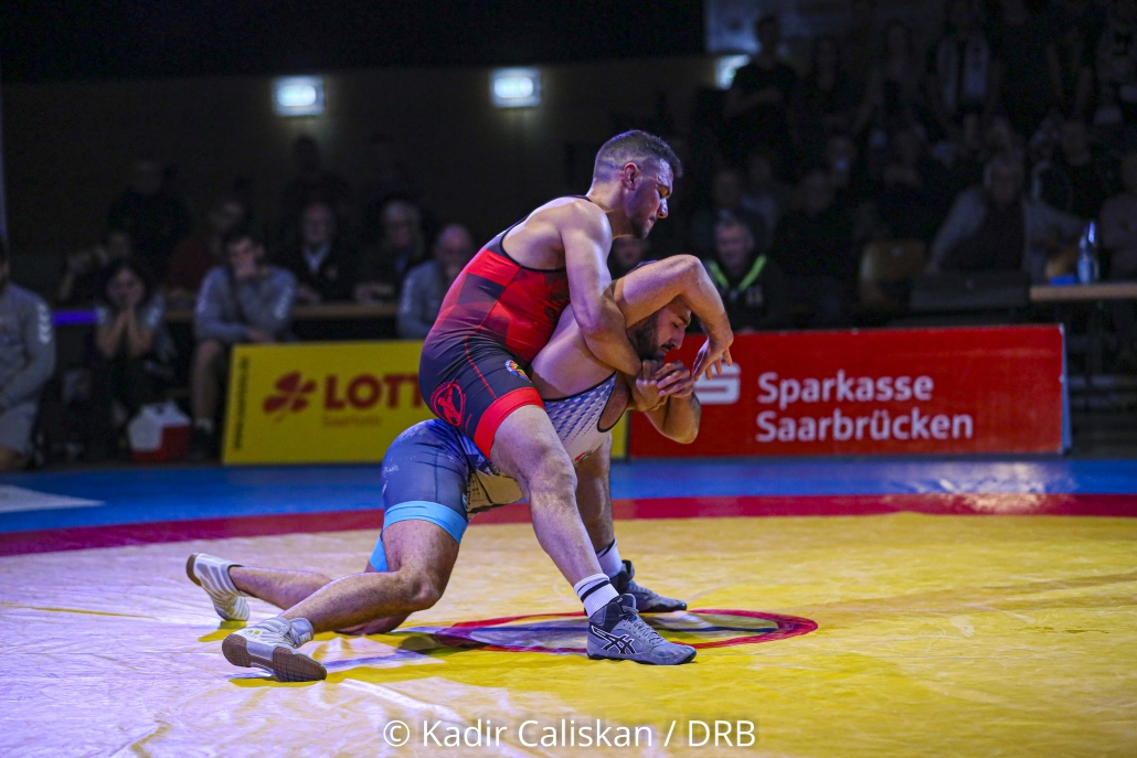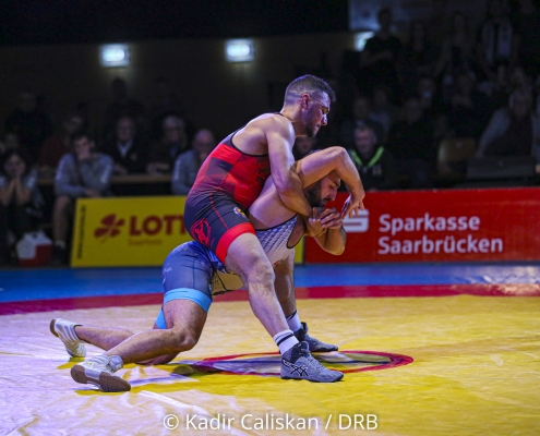 Danach kam es in der 75 kg Klasse A zum mit großer Spannung erwarteten Freistil-Duell zwischen dem amtierenden deutschen Meister Andrij Shyyka und dem dreifachen türkischen Europameister Söner Demirtas. Der 39 Jahre Köllerbacher Kult-Ringer kämpfte wie ein Löwe, doch gegen den wirklich starken Demirtas war an diesem Abend kein Kraut gewachsen. Der Türke in den Diensten des SV Wacker Burghausen gewann mit 7:0 nach Punkten. Dann brandete wieder Jubel bei den KSV-Fans auf, als in der Klasse bis 75 kg B Greco-Spezialist und Publikumsliebling Timo Badusch zum Kampf gegen den dreifachen deutschen Meister Matthias Maasch antrat. Der saarländische Polizeikommissar lieferte wieder einmal einen großen Kampf ab. Und mit Aushebern und Überwürfen geizte er auch dieses Mal nicht. Nach den vollen sechs Kampfminuten verbuchte das Kampfgericht einen klaren 13:3-Punktsieg für den souveränen KSV-Kapitän.