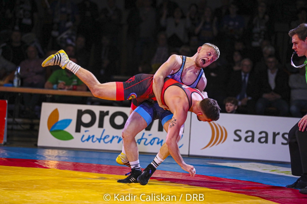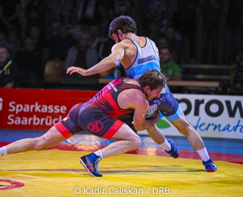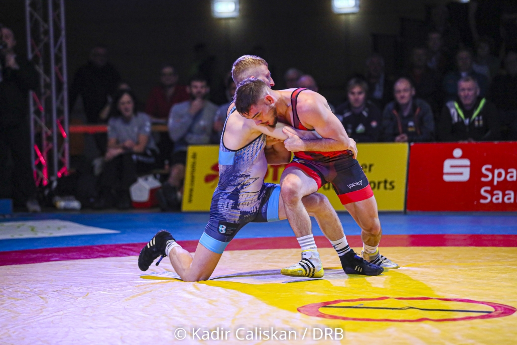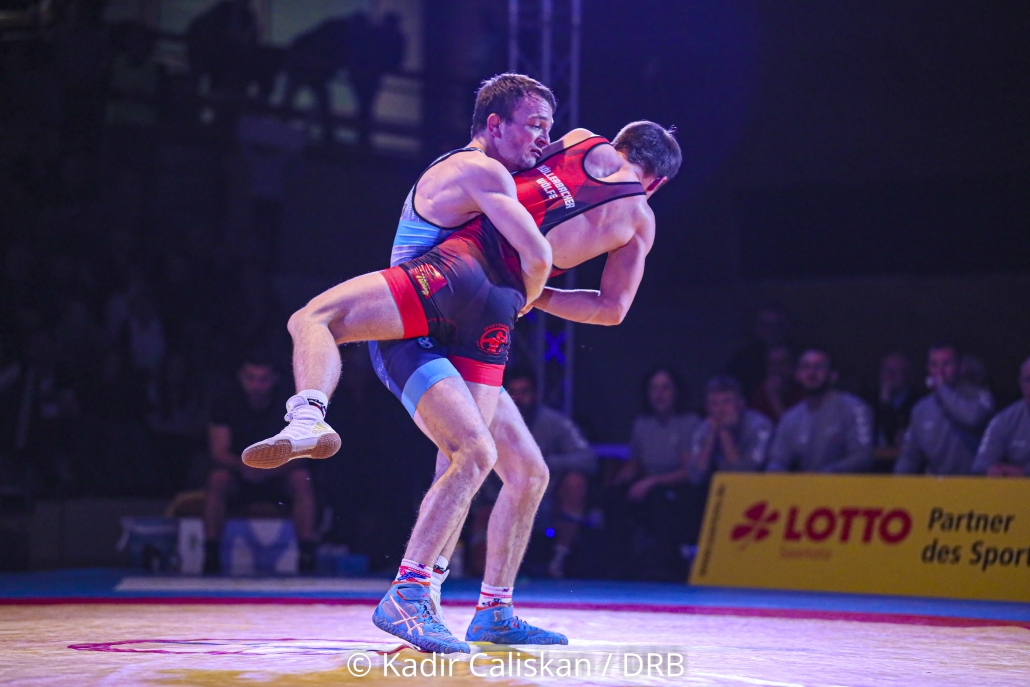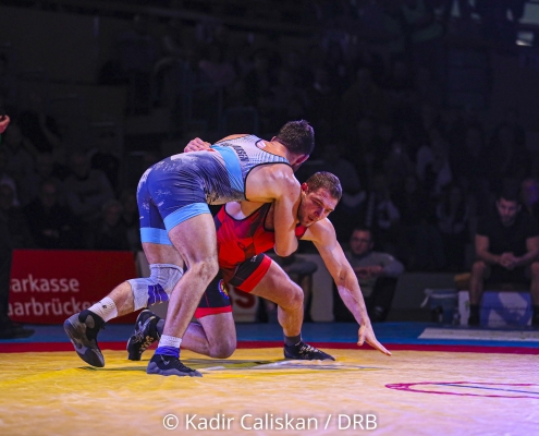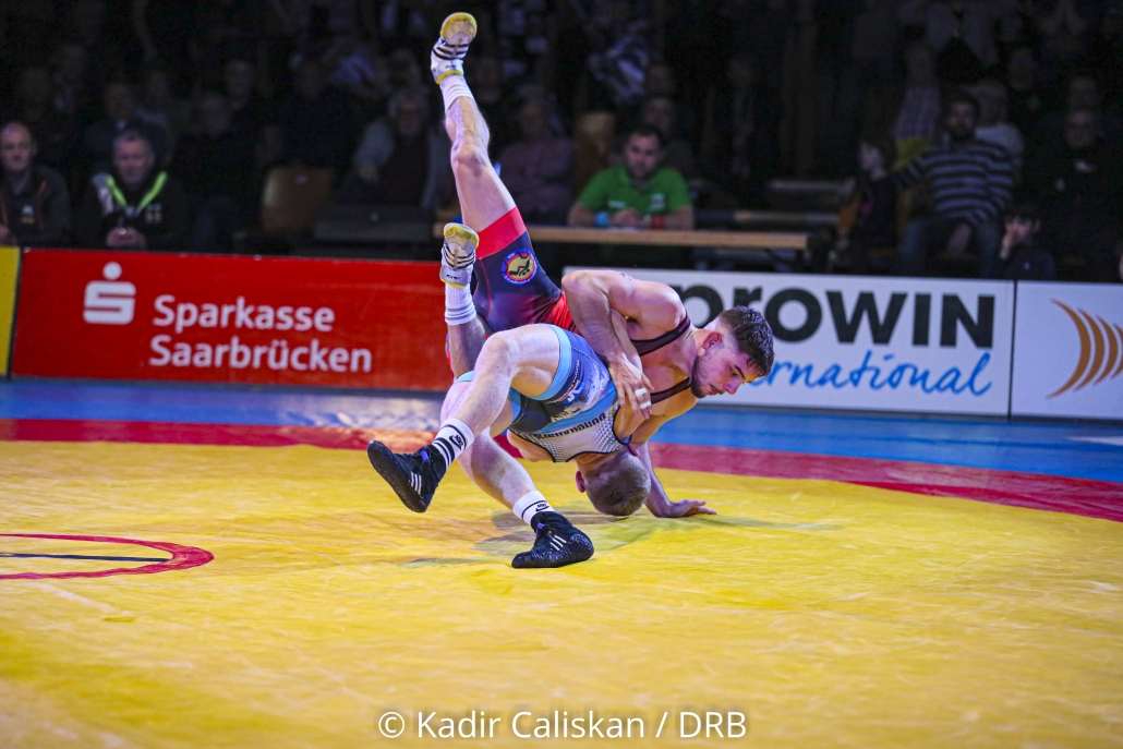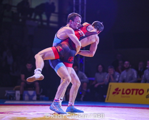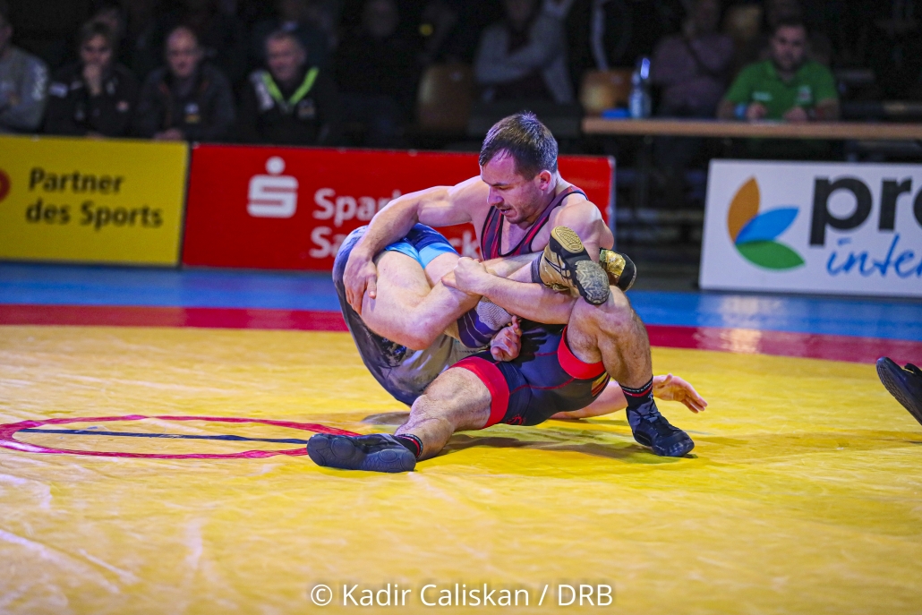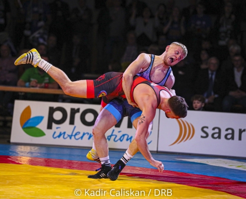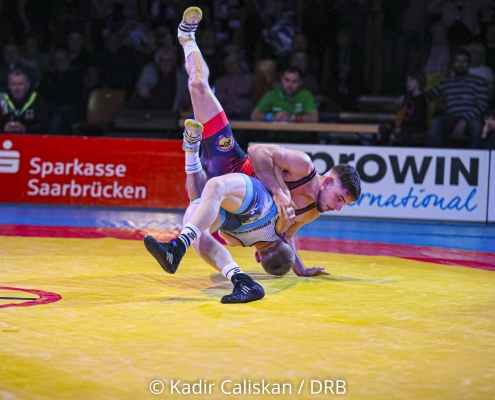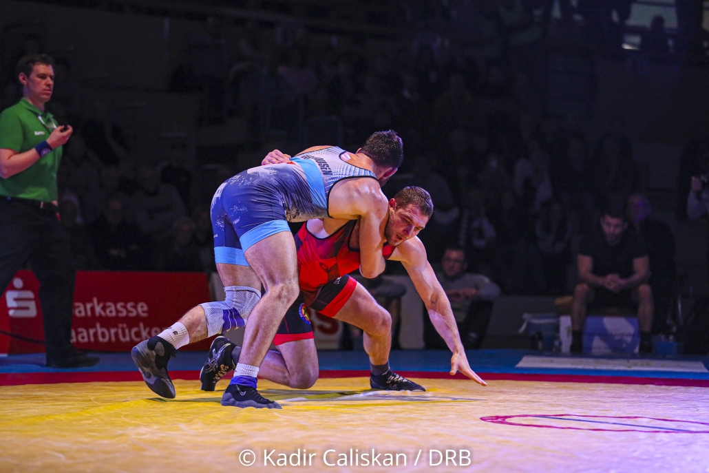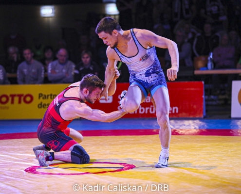 Danach kam es in der 75 kg Klasse A zum mit großer Spannung erwarteten Freistil-Duell zwischen dem amtierenden deutschen Meister Andrij Shyyka und dem dreifachen türkischen Europameister Söner Demirtas. Der 39 Jahre Köllerbacher Kult-Ringer kämpfte wie ein Löwe, doch gegen den wirklich starken Demirtas war an diesem Abend kein Kraut gewachsen. Der Türke in den Diensten des SV Wacker Burghausen gewann mit 7:0 nach Punkten. Dann brandete wieder Jubel bei den KSV-Fans auf, als in der Klasse bis 75 kg B Greco-Spezialist und Publikumsliebling Timo Badusch zum Kampf gegen den dreifachen deutschen Meister Matthias Maasch antrat. Der saarländische Polizeikommissar lieferte wieder einmal einen großen Kampf ab. Und mit Aushebern und Überwürfen geizte er auch dieses Mal nicht. Nach den vollen sechs Kampfminuten verbuchte das Kampfgericht einen klaren 13:3-Punktsieg für den souveränen KSV-Kapitän.