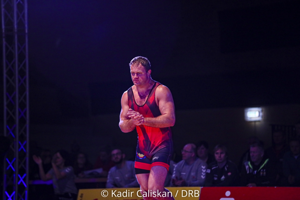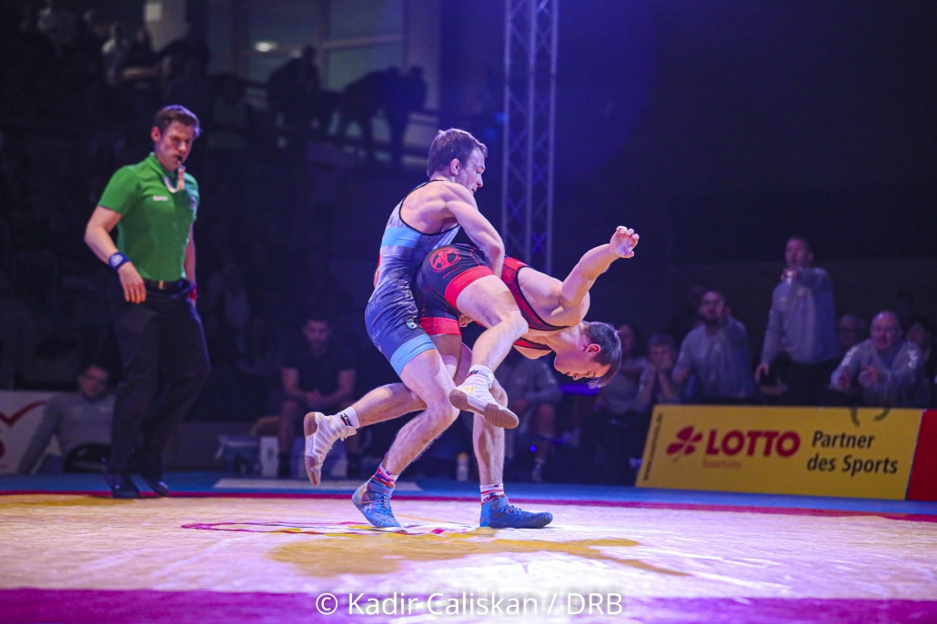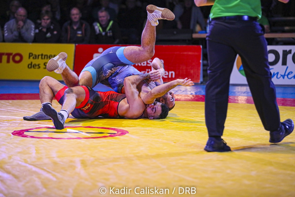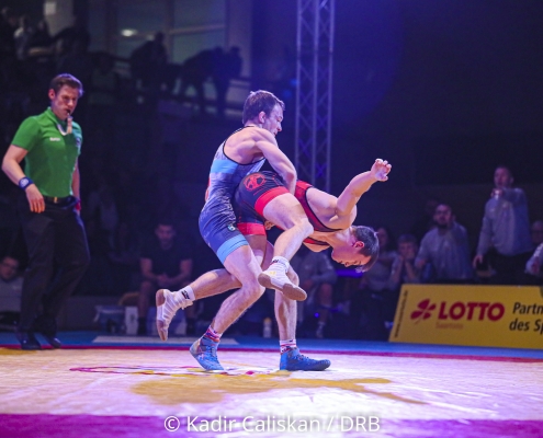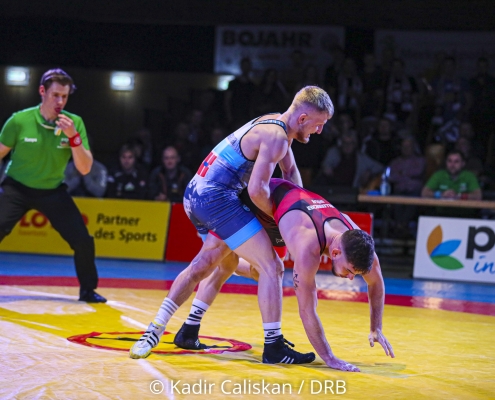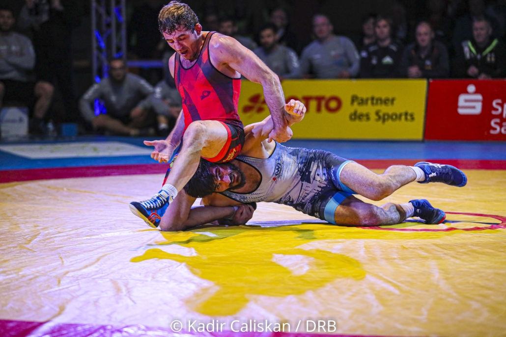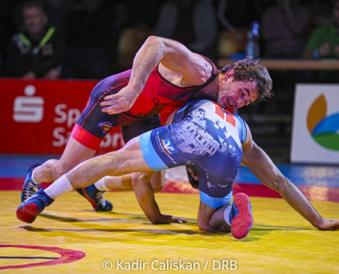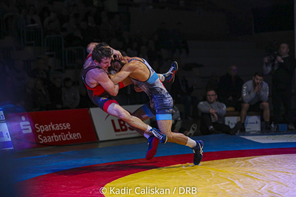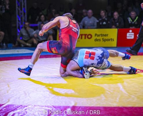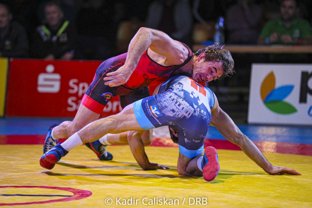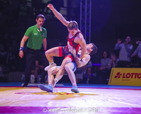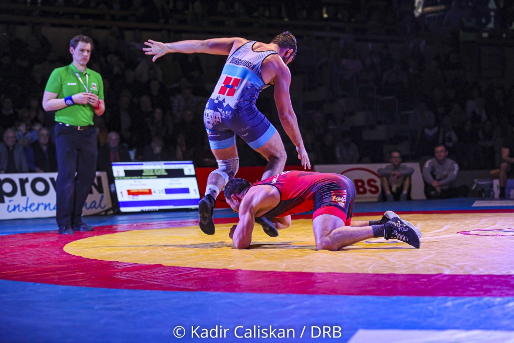 Danach kam es in der 75 kg Klasse A zum mit großer Spannung erwarteten Freistil-Duell zwischen dem amtierenden deutschen Meister Andrij Shyyka und dem dreifachen türkischen Europameister Söner Demirtas. Der 39 Jahre Köllerbacher Kult-Ringer kämpfte wie ein Löwe, doch gegen den wirklich starken Demirtas war an diesem Abend kein Kraut gewachsen. Der Türke in den Diensten des SV Wacker Burghausen gewann mit 7:0 nach Punkten. Dann brandete wieder Jubel bei den KSV-Fans auf, als in der Klasse bis 75 kg B Greco-Spezialist und Publikumsliebling Timo Badusch zum Kampf gegen den dreifachen deutschen Meister Matthias Maasch antrat. Der saarländische Polizeikommissar lieferte wieder einmal einen großen Kampf ab. Und mit Aushebern und Überwürfen geizte er auch dieses Mal nicht. Nach den vollen sechs Kampfminuten verbuchte das Kampfgericht einen klaren 13:3-Punktsieg für den souveränen KSV-Kapitän.