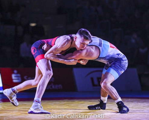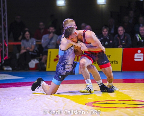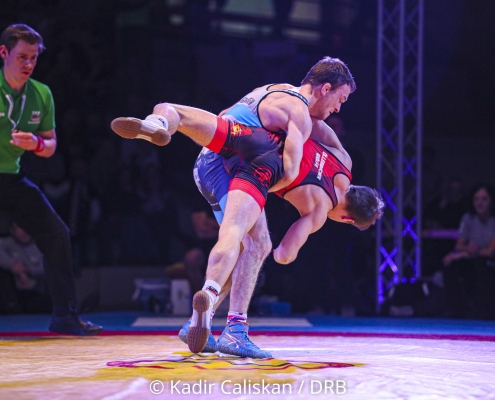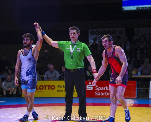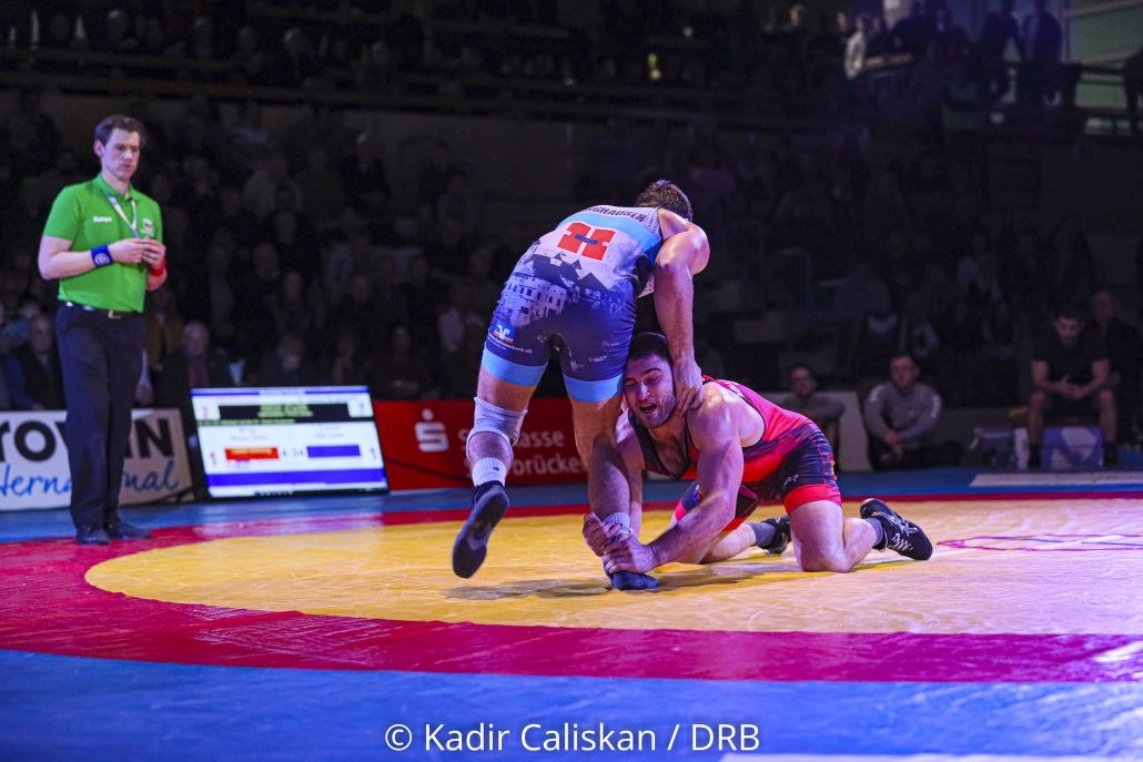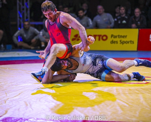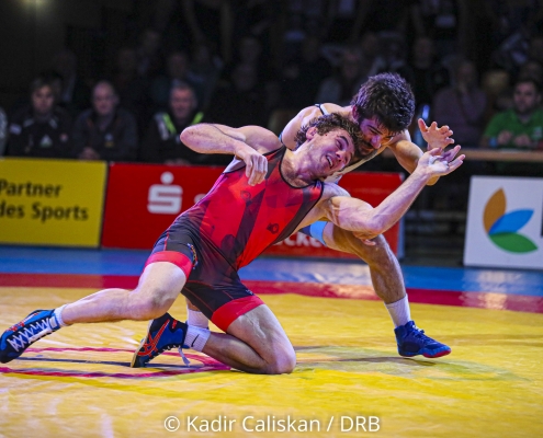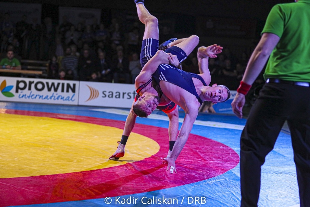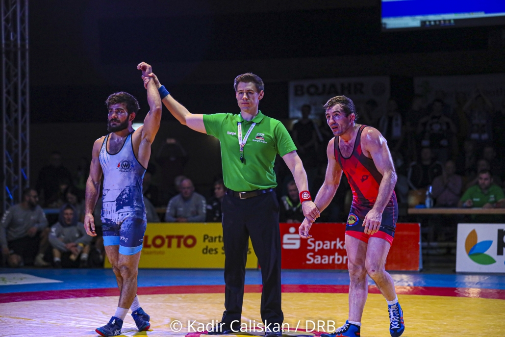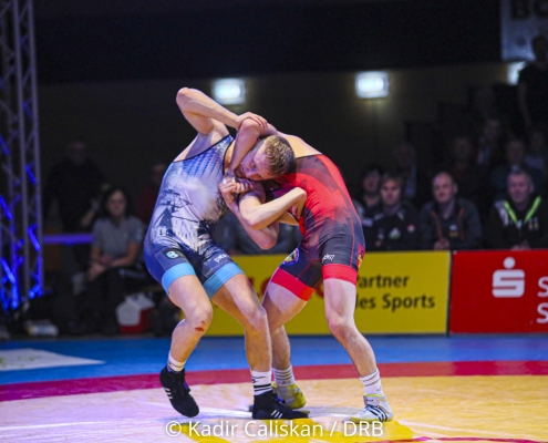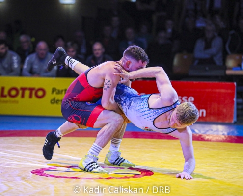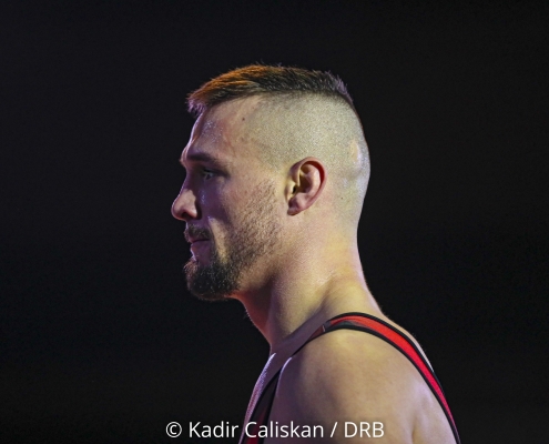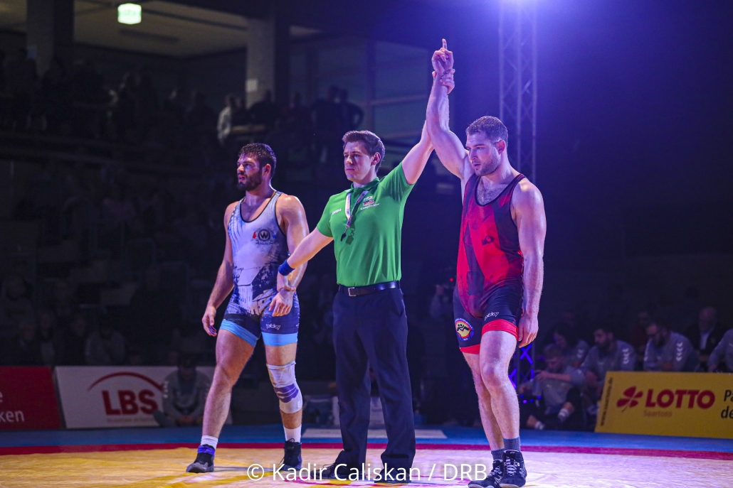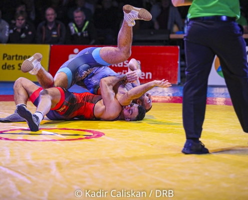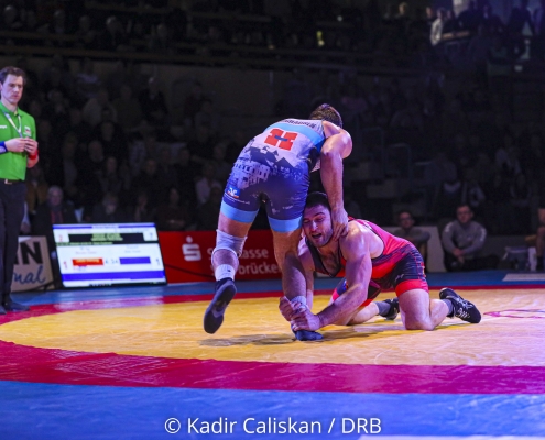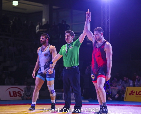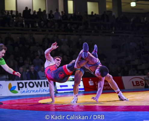 Danach kam es in der 75 kg Klasse A zum mit großer Spannung erwarteten Freistil-Duell zwischen dem amtierenden deutschen Meister Andrij Shyyka und dem dreifachen türkischen Europameister Söner Demirtas. Der 39 Jahre Köllerbacher Kult-Ringer kämpfte wie ein Löwe, doch gegen den wirklich starken Demirtas war an diesem Abend kein Kraut gewachsen. Der Türke in den Diensten des SV Wacker Burghausen gewann mit 7:0 nach Punkten. Dann brandete wieder Jubel bei den KSV-Fans auf, als in der Klasse bis 75 kg B Greco-Spezialist und Publikumsliebling Timo Badusch zum Kampf gegen den dreifachen deutschen Meister Matthias Maasch antrat. Der saarländische Polizeikommissar lieferte wieder einmal einen großen Kampf ab. Und mit Aushebern und Überwürfen geizte er auch dieses Mal nicht. Nach den vollen sechs Kampfminuten verbuchte das Kampfgericht einen klaren 13:3-Punktsieg für den souveränen KSV-Kapitän.