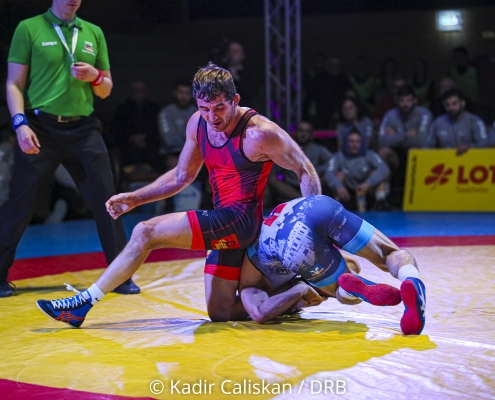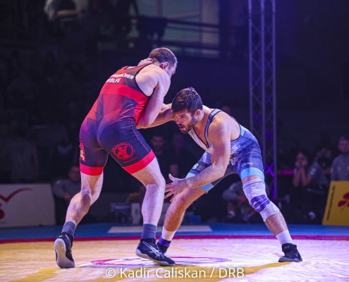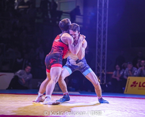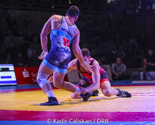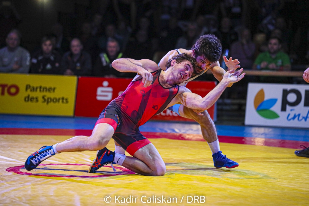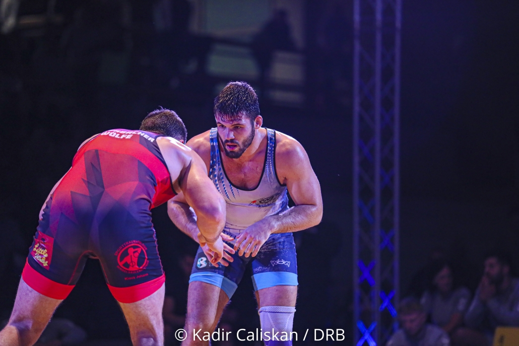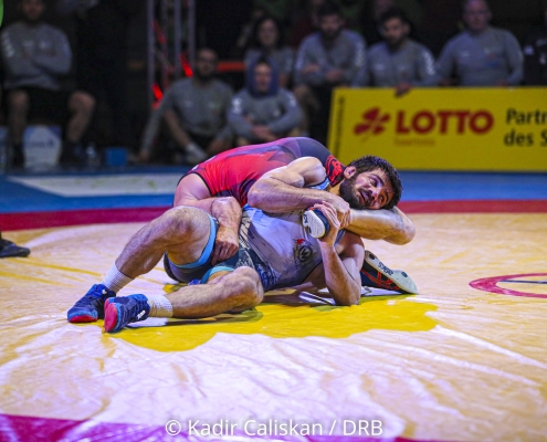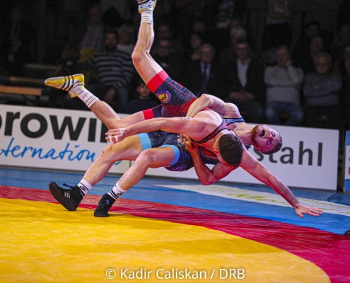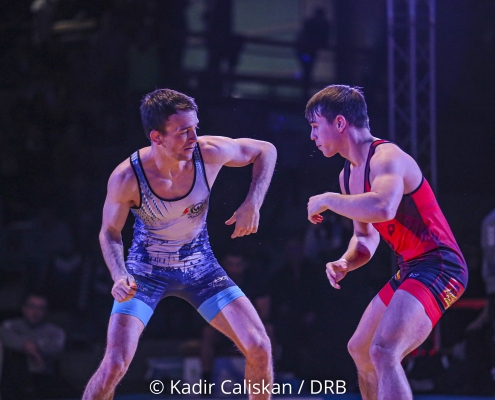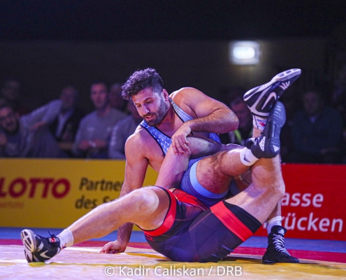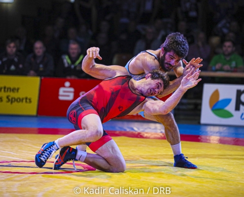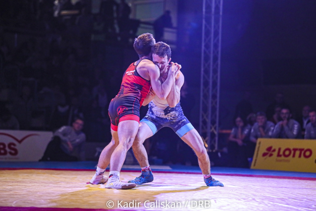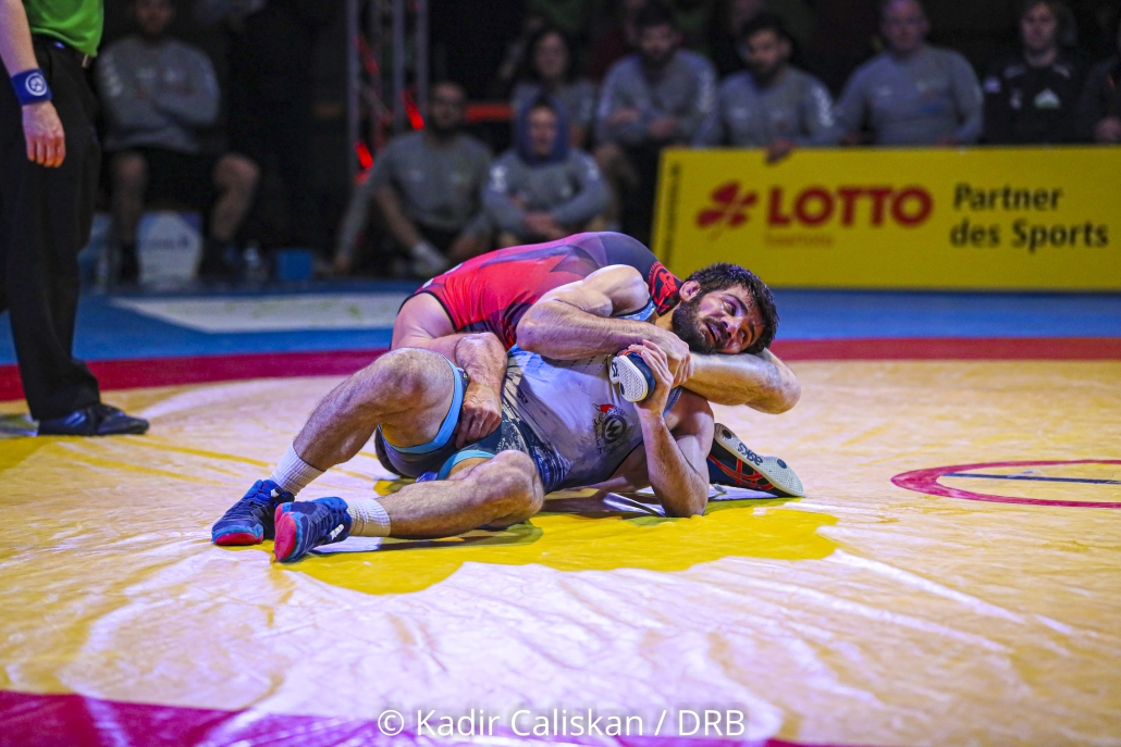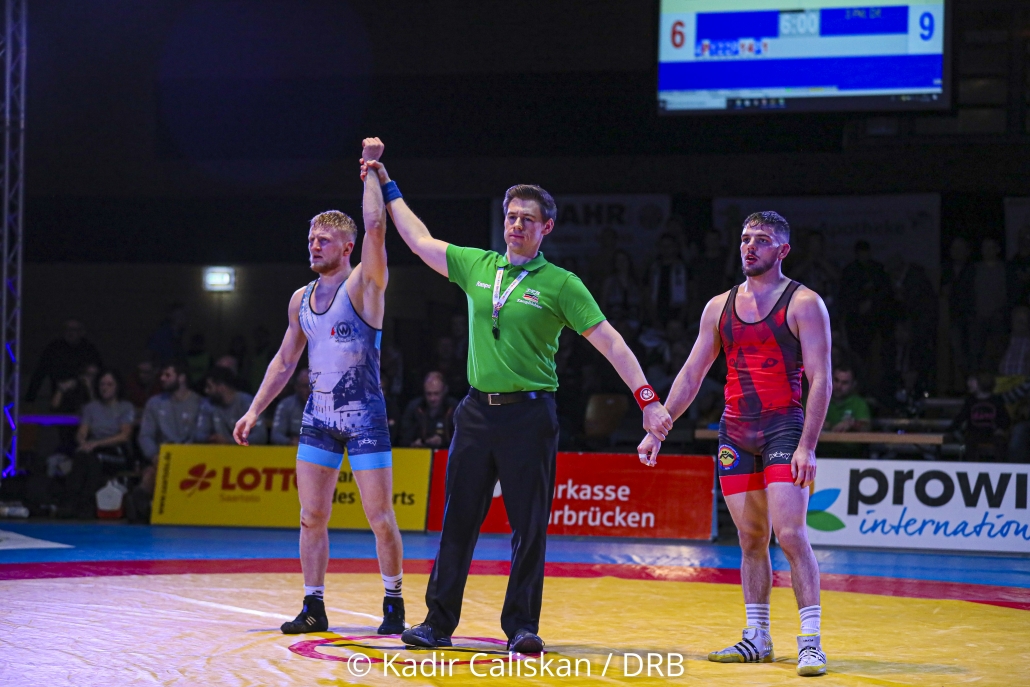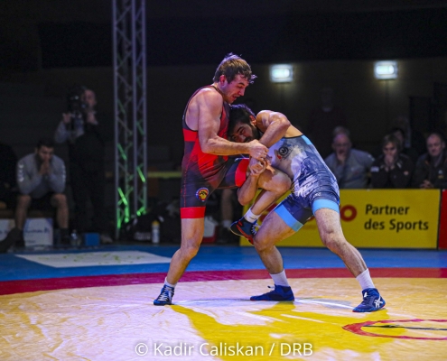 Danach kam es in der 75 kg Klasse A zum mit großer Spannung erwarteten Freistil-Duell zwischen dem amtierenden deutschen Meister Andrij Shyyka und dem dreifachen türkischen Europameister Söner Demirtas. Der 39 Jahre Köllerbacher Kult-Ringer kämpfte wie ein Löwe, doch gegen den wirklich starken Demirtas war an diesem Abend kein Kraut gewachsen. Der Türke in den Diensten des SV Wacker Burghausen gewann mit 7:0 nach Punkten. Dann brandete wieder Jubel bei den KSV-Fans auf, als in der Klasse bis 75 kg B Greco-Spezialist und Publikumsliebling Timo Badusch zum Kampf gegen den dreifachen deutschen Meister Matthias Maasch antrat. Der saarländische Polizeikommissar lieferte wieder einmal einen großen Kampf ab. Und mit Aushebern und Überwürfen geizte er auch dieses Mal nicht. Nach den vollen sechs Kampfminuten verbuchte das Kampfgericht einen klaren 13:3-Punktsieg für den souveränen KSV-Kapitän.