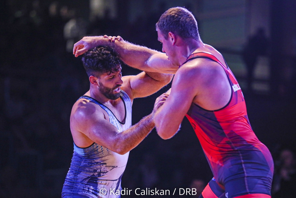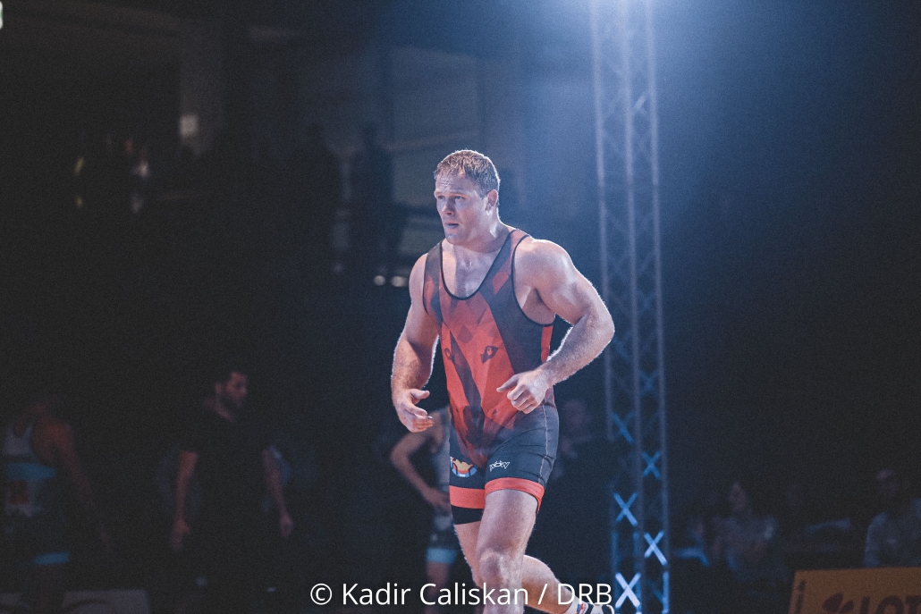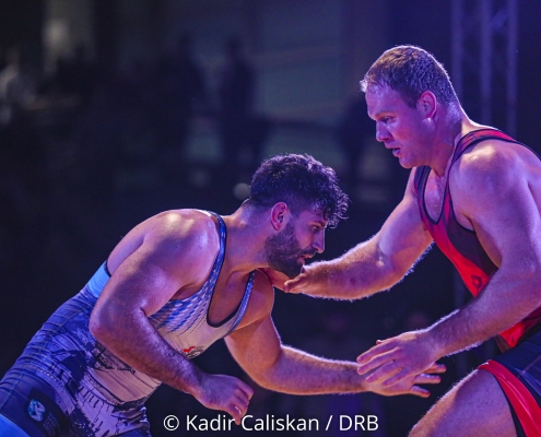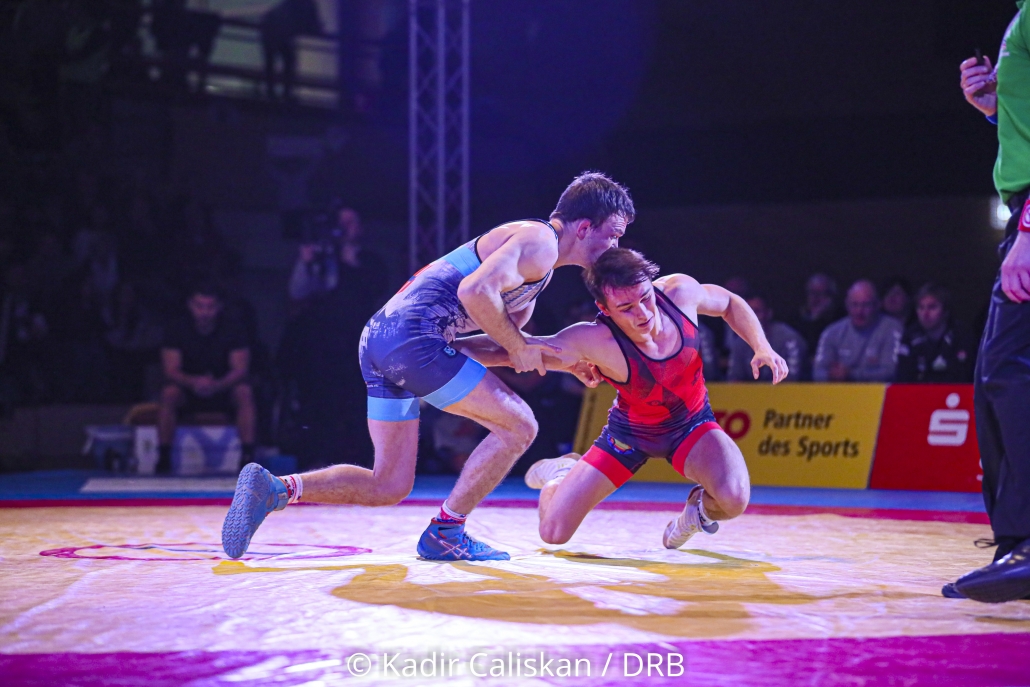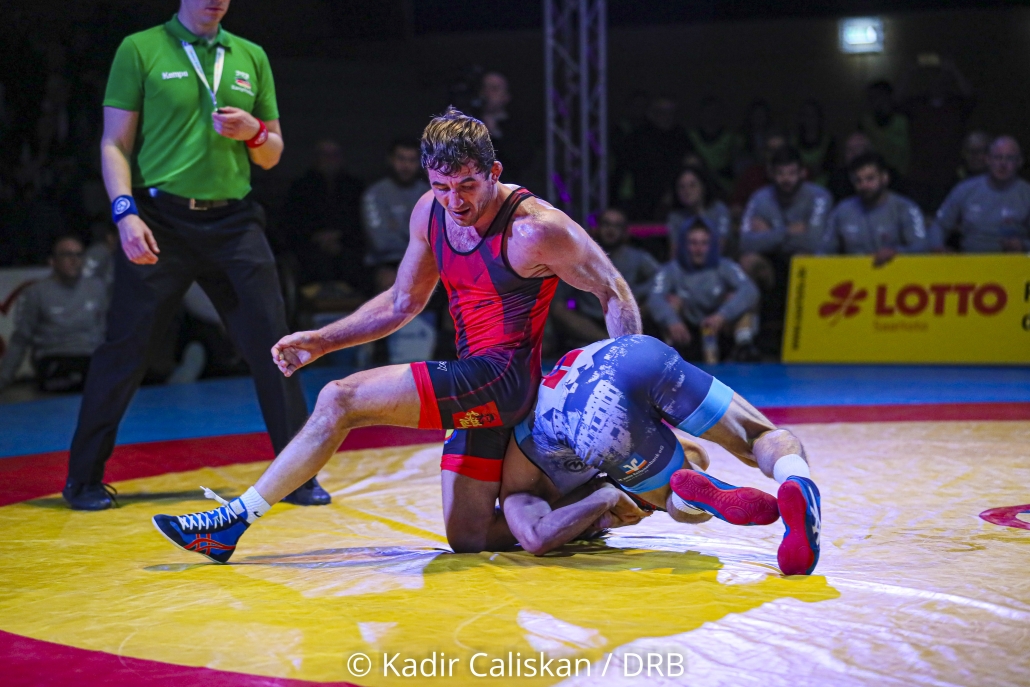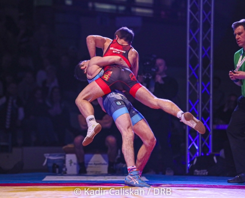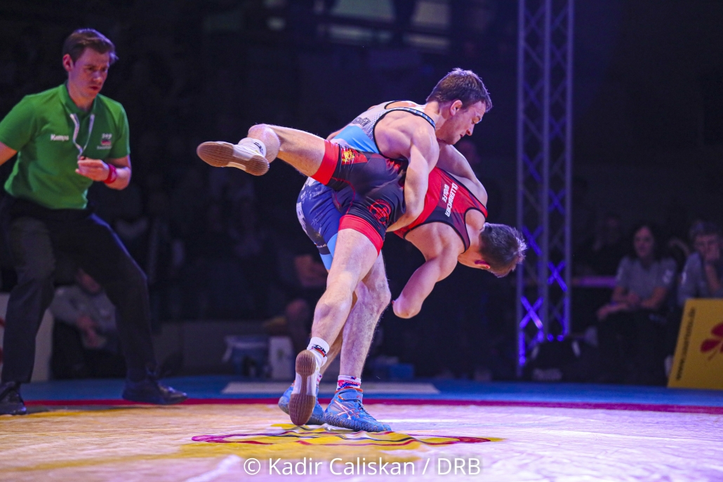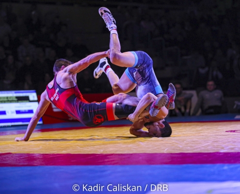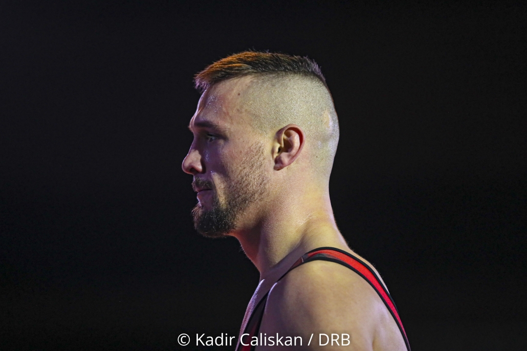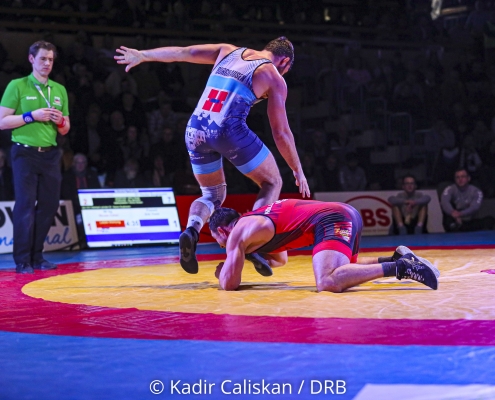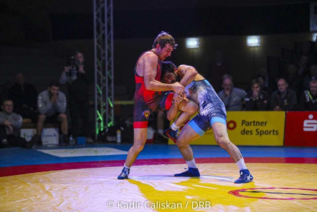 Danach kam es in der 75 kg Klasse A zum mit großer Spannung erwarteten Freistil-Duell zwischen dem amtierenden deutschen Meister Andrij Shyyka und dem dreifachen türkischen Europameister Söner Demirtas. Der 39 Jahre Köllerbacher Kult-Ringer kämpfte wie ein Löwe, doch gegen den wirklich starken Demirtas war an diesem Abend kein Kraut gewachsen. Der Türke in den Diensten des SV Wacker Burghausen gewann mit 7:0 nach Punkten. Dann brandete wieder Jubel bei den KSV-Fans auf, als in der Klasse bis 75 kg B Greco-Spezialist und Publikumsliebling Timo Badusch zum Kampf gegen den dreifachen deutschen Meister Matthias Maasch antrat. Der saarländische Polizeikommissar lieferte wieder einmal einen großen Kampf ab. Und mit Aushebern und Überwürfen geizte er auch dieses Mal nicht. Nach den vollen sechs Kampfminuten verbuchte das Kampfgericht einen klaren 13:3-Punktsieg für den souveränen KSV-Kapitän.
