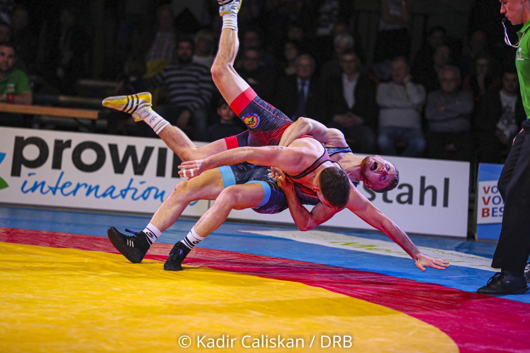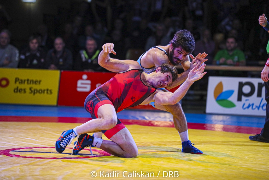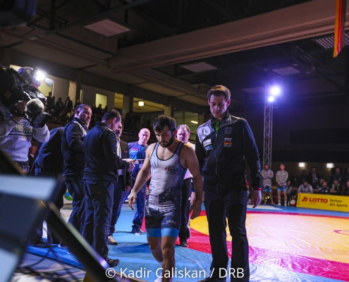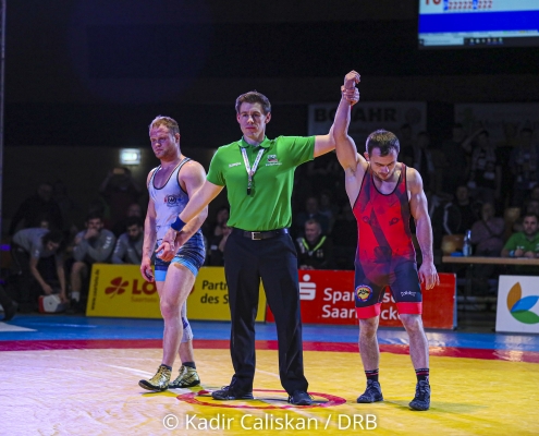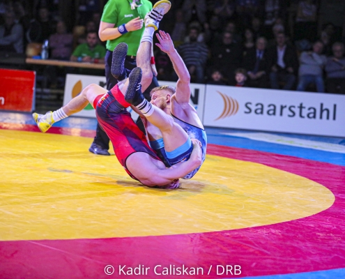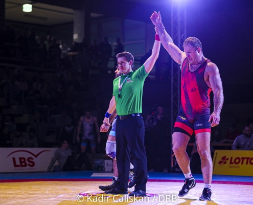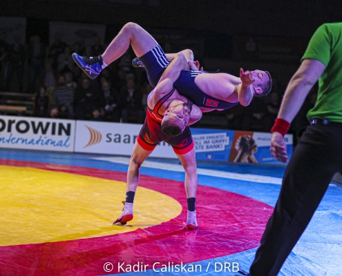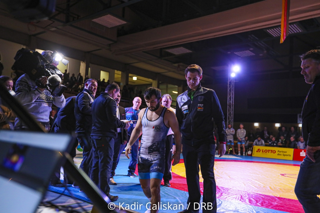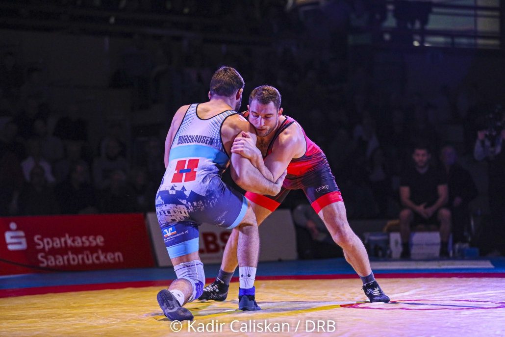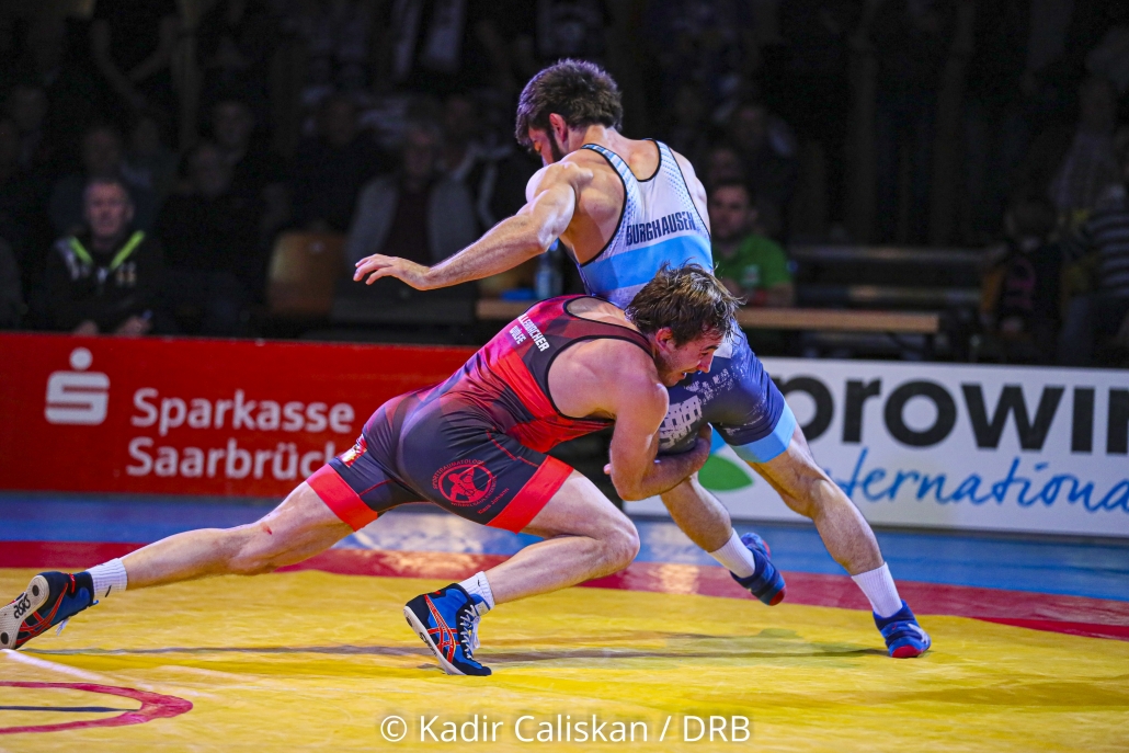 In der Völklinger Hermann-Neuberger-Halle ließ sich KSV-Teamleiter Thomas Geid indessen von diesem Ballyhoo nicht aus der Ruhe bringen. Er schenkte einer Köllerbacher Mannschaft das Vertrauen, die an diesem Samstagabend dem SV Wacker Burghausen auf Augenhöhe begegnete. Die Zuschauer erlebten ein Super-Spektakel und brauchten ihr Kommen wahrlich nicht zu bereuen. Am Schluss stand es ganz knapp 15:13 für den Titelverteidiger, doch Köllerbach hätte sich aufgrund seiner starken Mannschaftsleistung durchaus ein Remis verdient gehabt. Sogar ein knapper Sieg lag für die Saarländer im Bereich des Möglichen. Die beiden Finalisten stellten an diesem denkwürdigen Ringer-Abend jeweils fünf Sieger. Doch die Top-Stimmung in der Halle schwappte erst endgültig nach der Halbzeit über, denn nach fünf Kämpfen stand auf der Anzeigentafel noch ein 11:3 für das Team aus Oberbayern. So wurde in der leichtesten Gewichtsklasse bis 57 kg der Köllerbacher Youngster Giovanni Comparetto von dem früheren dreifachen türkischen Juniorenweltmeister Ahmet Peker nach knapp 90 Sekunden geschultert. Im Greco-Schwergewicht dagegen setzte sich der Este Heiki Nabi, der in den Diensten des KSV Köllerbach steht, gegen den zweifachen deutschen Meister Ramsin Azizsir sicher mit 4:0 nach Punkten durch. In der Gewichtsklasse bis 61 kg bot der Köllerbacher Greco-Spezialist Steven Ecker von der Kampfkraft her alles Menschenmögliche auf. Doch gegen Andreas Maier, den deutschen Vizemeister des Jahres 2018, konnte er letztlich eine 0:9-Punktniederlage nicht vermeiden.
