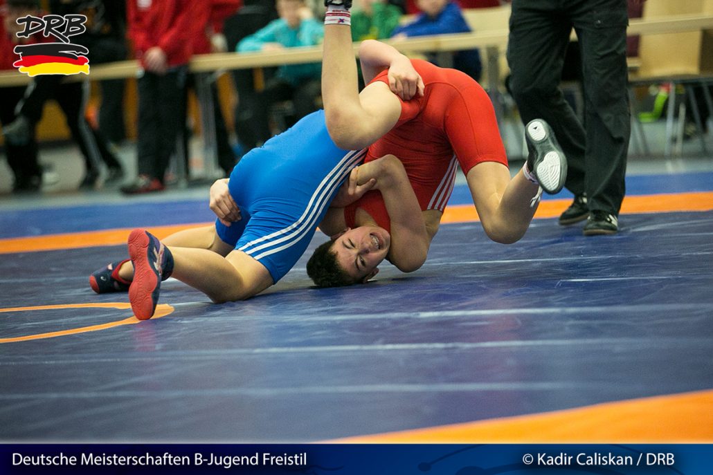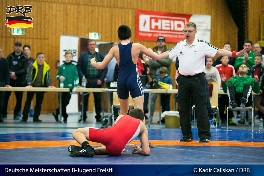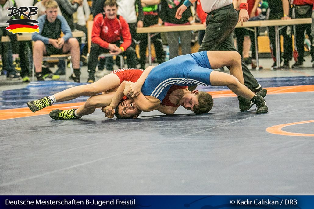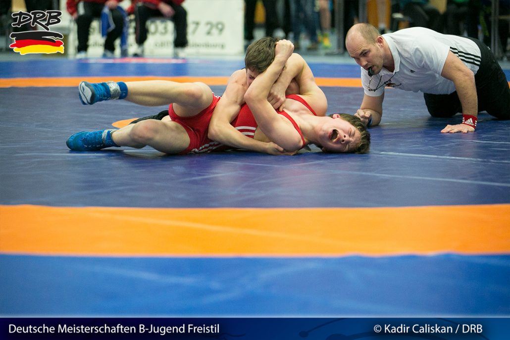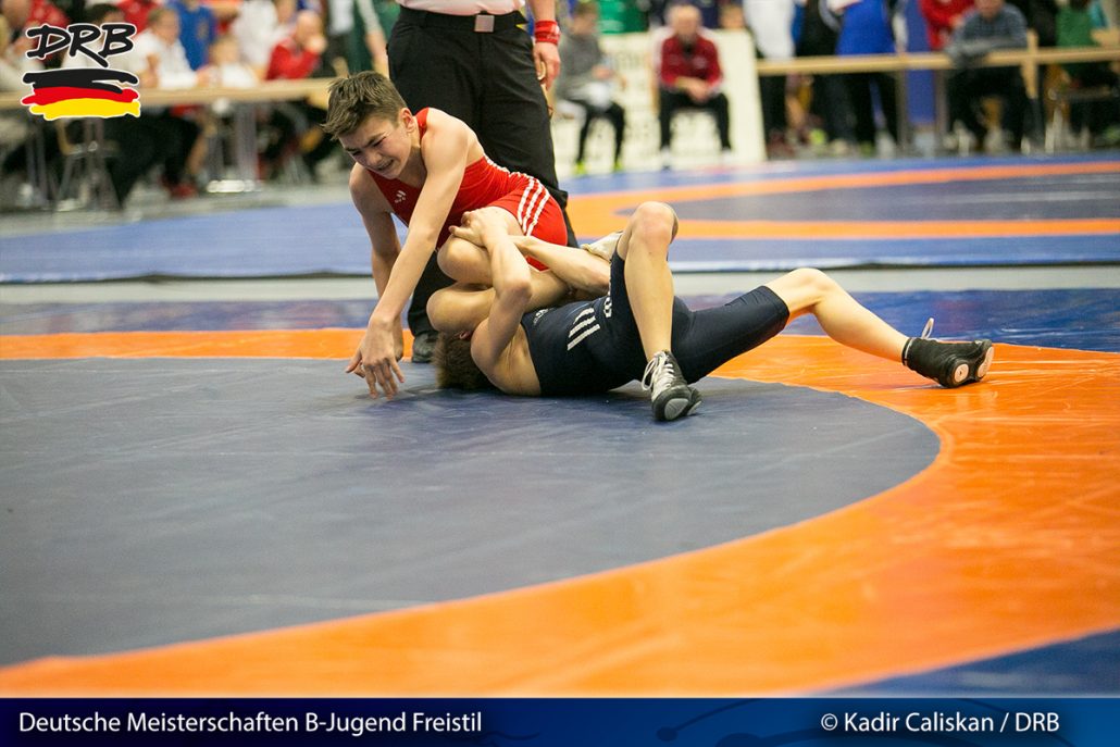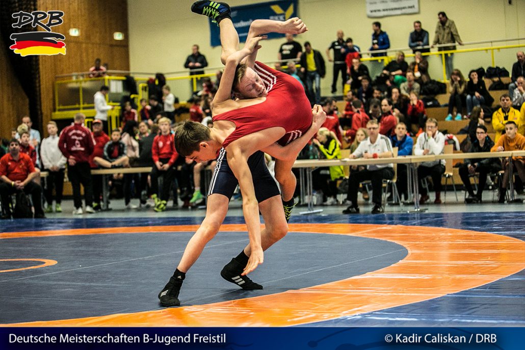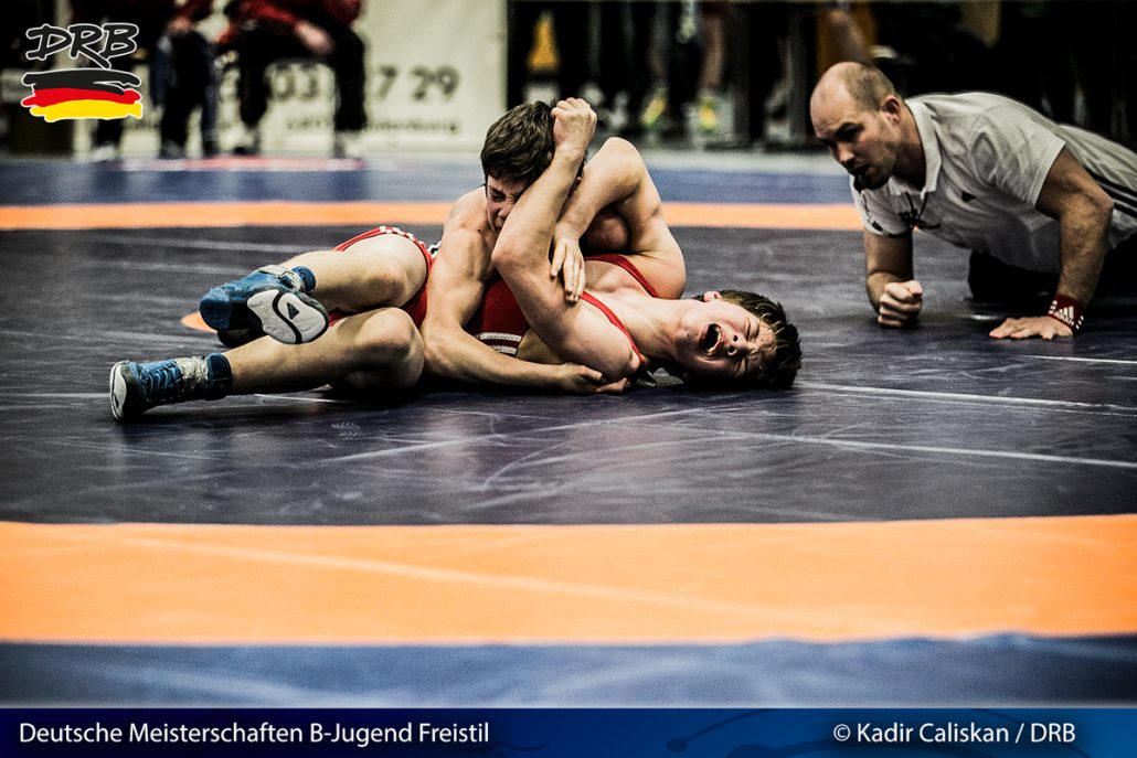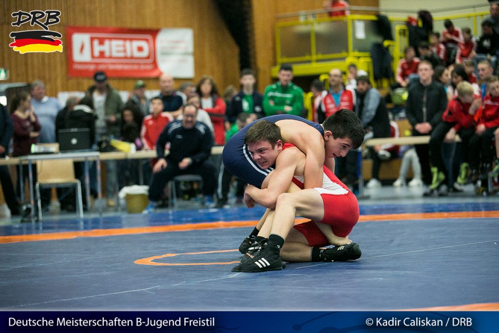 Am vergangenen Wochenende (17.03.-19.03.) fanden die deutschen Titelkämpfe der B-Jugend statt. Die Wettkämpfe im freien Stil richtete der ASV Ladenburg in Heddesheim aus. Besonders wohl bei ihren Nachbarn in Nordbaden fühlten sich die Ringer aus Südbaden, die sich mit großem Abstand die Länderwertung sicherten. Am Sonntag stellten sich gar sieben Finalisten, das heißt mehr als jeder dritte Finalteilnehmer kam aus Südbaden. Am Ende sprangen dabei vier Titel durch Thomas Eckhardt (34kg), Dario Dittrich (42kg), Andrej Schwarzkopf (50kg) und Luca Munz (54kg) heraus. Die verbliebenen sechs Titel verteilten sich quer durch die Bundesrepublik. Bis 38kg siegte auf besonders beeindruckende Art und Weise Karamjeet Holstein (Sachsen), der Titel bis 46kg ging ins Saarland an Veysel Karakök. Philipp Nguyen Ho aus Warnemünde (MEV) hatte bis 58kg wenig Probleme mit der Konkurrenz und holte mit drei vorzeitigen Siegen Gold. Württemberg ergatterte seine einzige Goldmedaille bis 63kg, wo Stas David Wolf nach kleinen Startschwierigkeiten am Samstagmorgen souverän zum Titel marschierte. Gegen lediglich zwei Gegner musste sich Nori Opiela aus Thüringen im Limit bis 69kg durchsetzen um ganz oben auf dem Treppchen zu stehen. Im schwersten Gewicht bis 76kg ging Gold an die sonst so erfolgsverwöhnten Bayern, Yusuf Senyigit vom SV Johannis Nürnberg räumte am Samstag Emil Thiele, Sohn von Ex-Bundestrainer Sven, in einem spannenden Duell mit 5:2 aus dem Weg und ließ sich dann den ersten Platz nicht mehr nehmen.