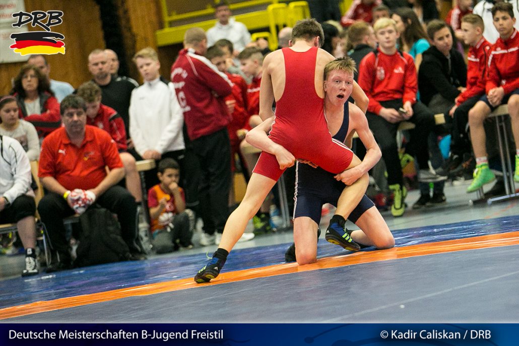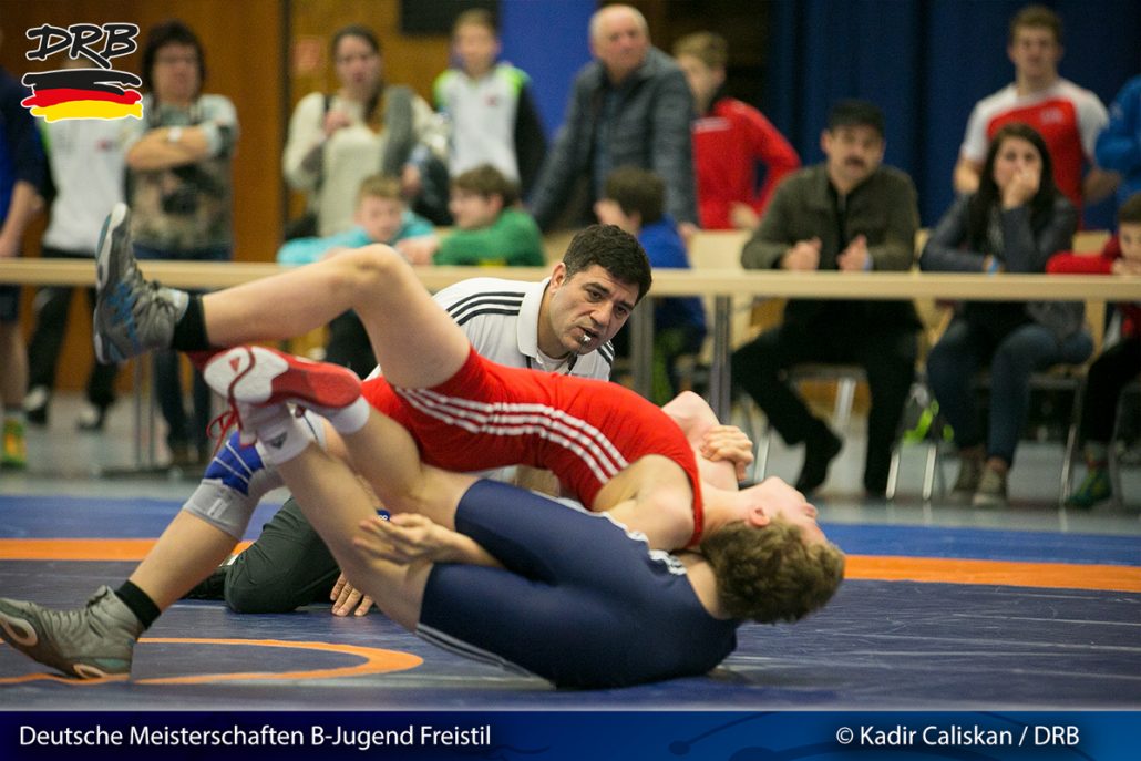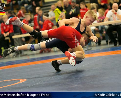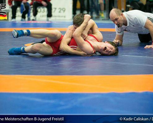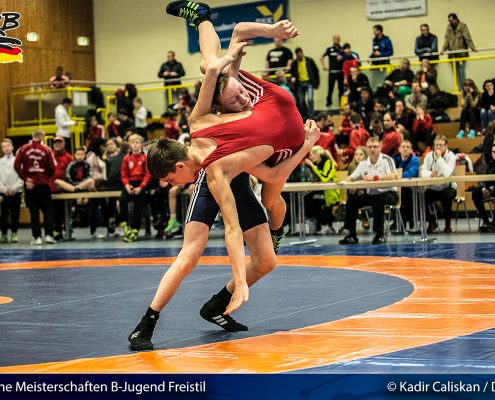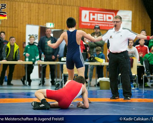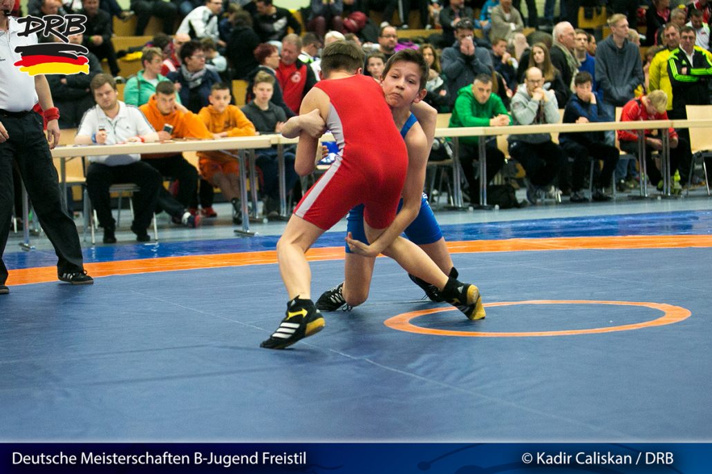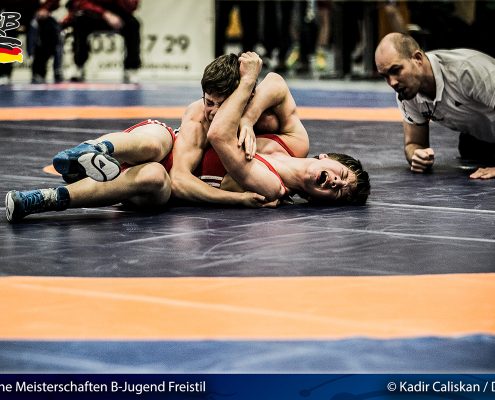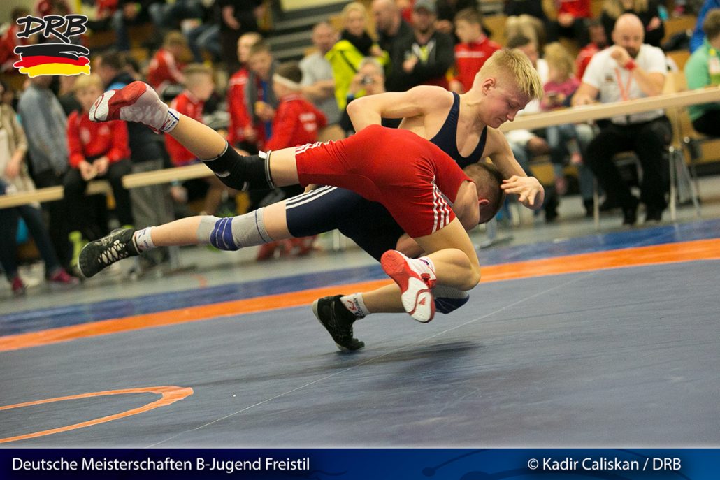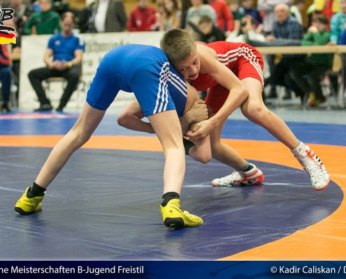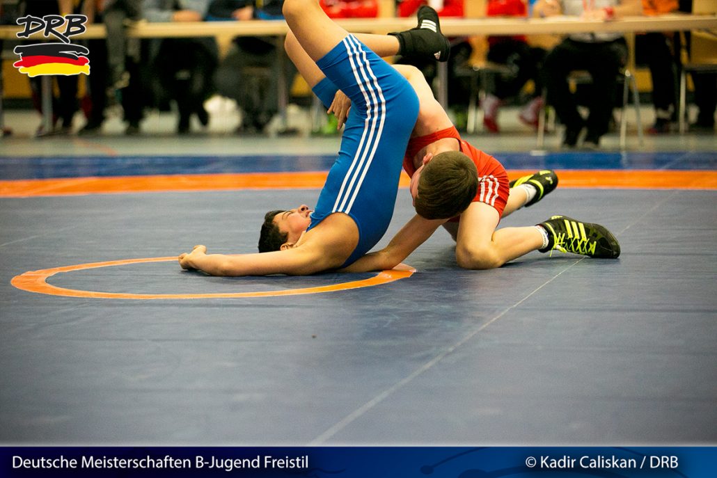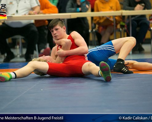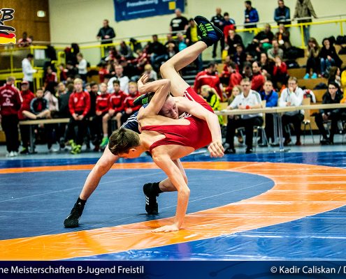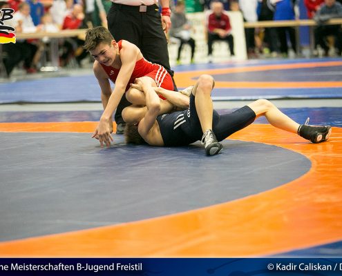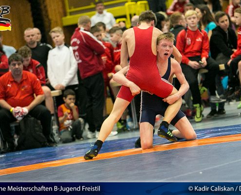 Am vergangenen Wochenende (17.03.-19.03.) fanden die deutschen Titelkämpfe der B-Jugend statt. Die Wettkämpfe im freien Stil richtete der ASV Ladenburg in Heddesheim aus. Besonders wohl bei ihren Nachbarn in Nordbaden fühlten sich die Ringer aus Südbaden, die sich mit großem Abstand die Länderwertung sicherten. Am Sonntag stellten sich gar sieben Finalisten, das heißt mehr als jeder dritte Finalteilnehmer kam aus Südbaden. Am Ende sprangen dabei vier Titel durch Thomas Eckhardt (34kg), Dario Dittrich (42kg), Andrej Schwarzkopf (50kg) und Luca Munz (54kg) heraus. Die verbliebenen sechs Titel verteilten sich quer durch die Bundesrepublik. Bis 38kg siegte auf besonders beeindruckende Art und Weise Karamjeet Holstein (Sachsen), der Titel bis 46kg ging ins Saarland an Veysel Karakök. Philipp Nguyen Ho aus Warnemünde (MEV) hatte bis 58kg wenig Probleme mit der Konkurrenz und holte mit drei vorzeitigen Siegen Gold. Württemberg ergatterte seine einzige Goldmedaille bis 63kg, wo Stas David Wolf nach kleinen Startschwierigkeiten am Samstagmorgen souverän zum Titel marschierte. Gegen lediglich zwei Gegner musste sich Nori Opiela aus Thüringen im Limit bis 69kg durchsetzen um ganz oben auf dem Treppchen zu stehen. Im schwersten Gewicht bis 76kg ging Gold an die sonst so erfolgsverwöhnten Bayern, Yusuf Senyigit vom SV Johannis Nürnberg räumte am Samstag Emil Thiele, Sohn von Ex-Bundestrainer Sven, in einem spannenden Duell mit 5:2 aus dem Weg und ließ sich dann den ersten Platz nicht mehr nehmen.