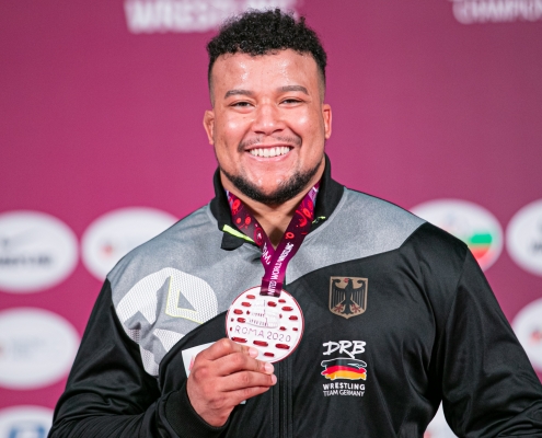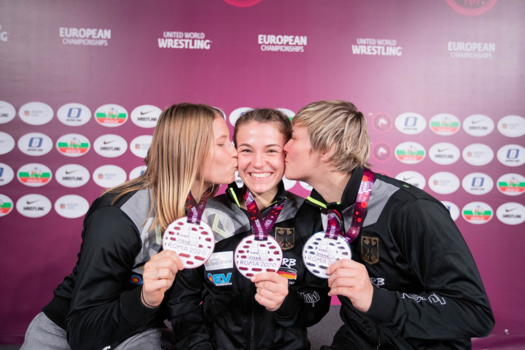 In der Wochenmitte übernahmen die Frauen die Wettkampfstätte in Rom und auch hier gab es für den Deutschen Ringer Bund sage und schreibe drei EM-Medaillen zu bejubeln. Aline Rotter-Focken, die ein Dauer-Abo auf internationale Medaillen zu haben scheint, und Annika Wendle gewinnen Bronze, Silber für Maria Selmaier gab es wie schon bei den griechisch Kollegen ebenfalls eine Medaillenpremiere. Besonders erfreulich bei den Damen ist die Ausgeglichenheit im gesamten Team. Auch wenn arrivierte Sportlerinnen wie Luisa Niemesch oder die WM-Dritte Anna Schell die Medaillenränge knapp verpassen, springen andere Sportlerinnen in die Bresche und sichern so wieder ein tolles Gesamtergebnis. Trotz unglücklicher Finals an Tag 4, als vier Ringerinnen im kleinen Finale um Bronze standen und bis auf Aline alle unterlagen, sprangen am Ende drei Medaillen heraus. Allen voran Maria Selmaier belohnte sich für ihren langjährigen unermüdlichen Einsatz, bestätigte ihre tolle Frühform der internationalen Turniere auch bei der EM und rang sich bis ins Finale vor. In einem von Taktik geprägten Halbfinalduell gegen Catalina Axente (ROU) setzte sich Maria souverän mit 8:3 durch. Im Finale lautete die Gegnerin allerdings Weltmeisterin und Vize-Olympiasiegerin Vorobieva (RUS). Maria konnte hier für keine Überraschung sorgen, die Silbermedaille bleibt jedoch ein Riesenerfolg.