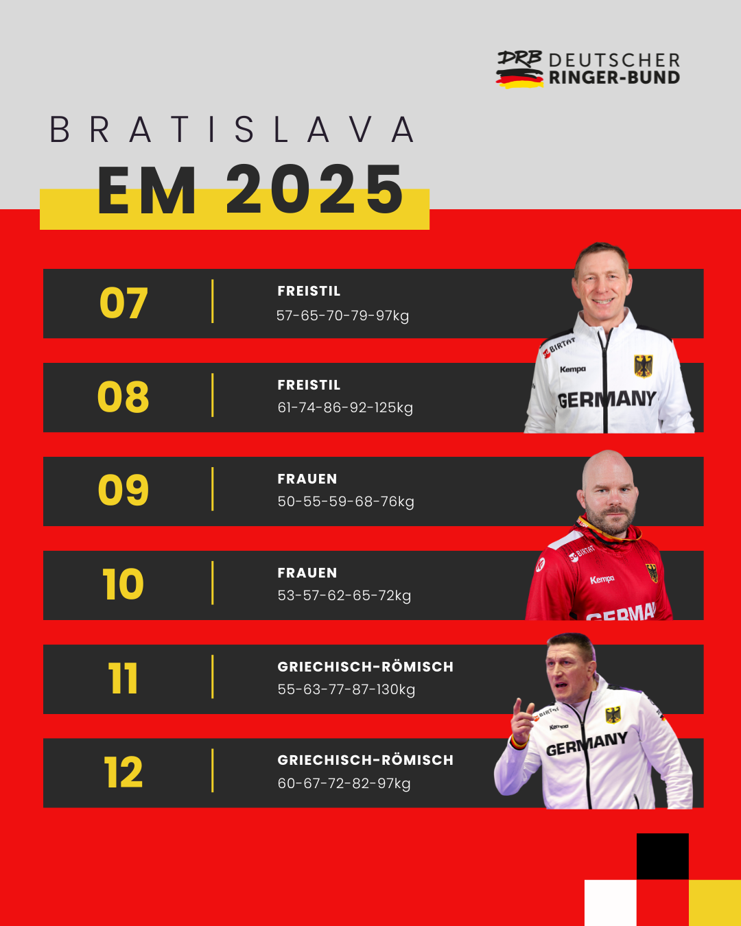 Die europäische Ringer-Elite trifft sich vom 7. bis 13. April 2025 in der slowakischen Hauptstadt Bratislava, wenn es bei den Europameisterschaften wieder um Titel, Medaillen – und wichtige Impulse im neuen Olympiazyklus in Richtung Olympische Spiele 2028 geht.
