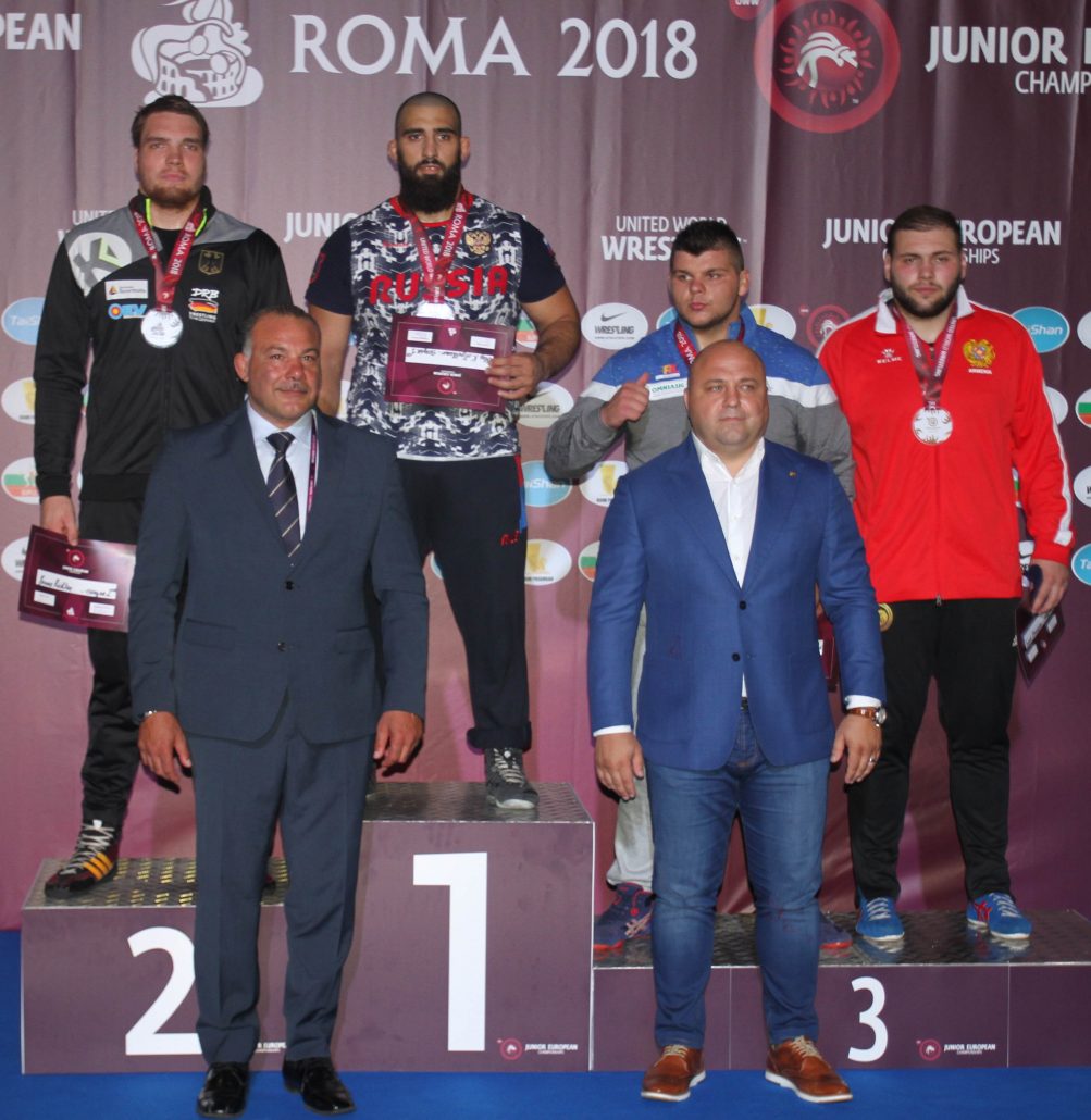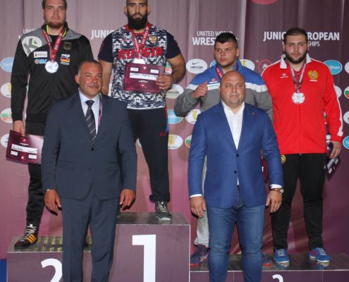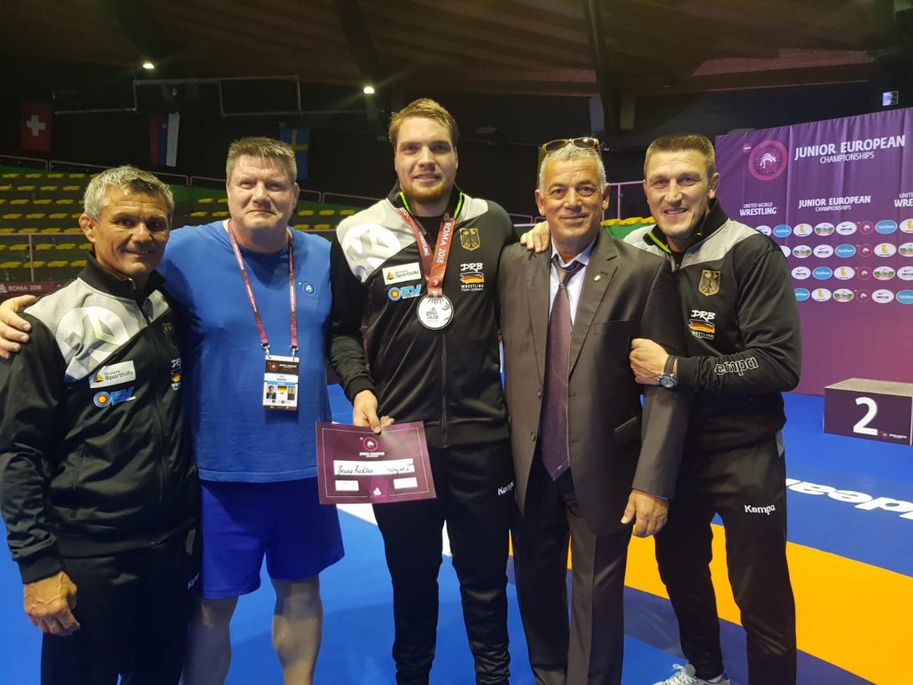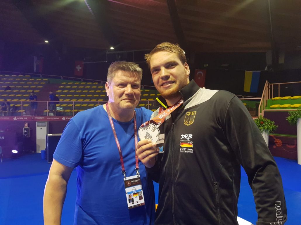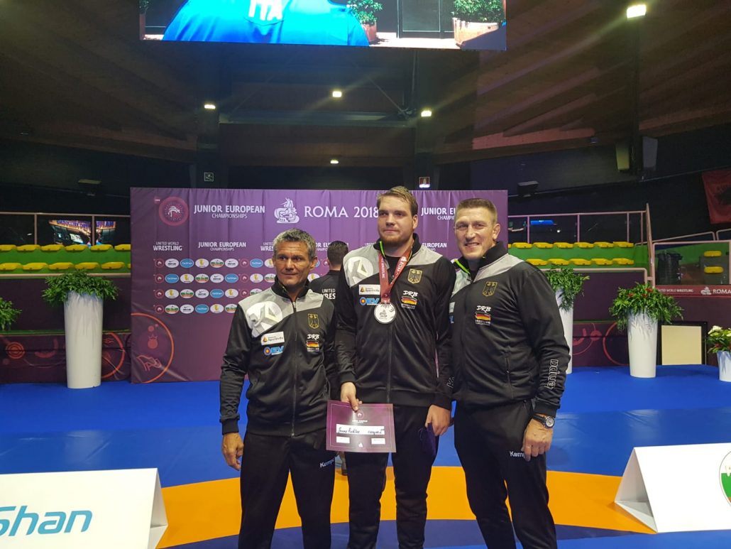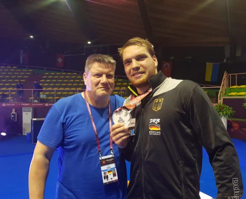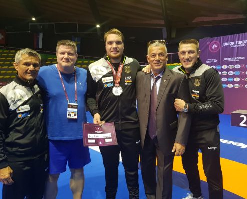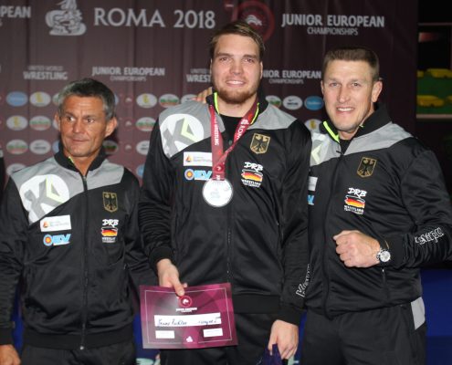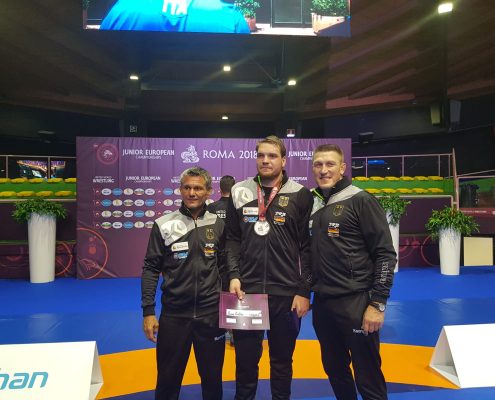 Rom – Franz Richter (130 kg/AV Germania Markneukirchen) hat bei den Europameisterschaften der Junioren in Rom (ITA) die Silbermedaille gewonnen. Im Finale unterlag er dem Russen Oleg Agakhanov nach einer Konterattacke im Bodenkampf auf Schulter. „Das war ein Lucky-Punch für den Russen“, so die erste Reaktion von Bundestrainer Maik Bullmann. Es hat nur ein Millimeter gefehlt und er hätte den Russen gerollt“, so Bullmann, der mit der Turnierleistung des Markneukirchners sehr zufrieden war. „Er hat mich hier überrascht, in den Vorrundenbegegnungen stark gerungen und ich bin mir sicher, dass er auch Agakhanov schlägt, wenn er ihn gerollt hätte“, so ein zufriedener Bundestrainer.