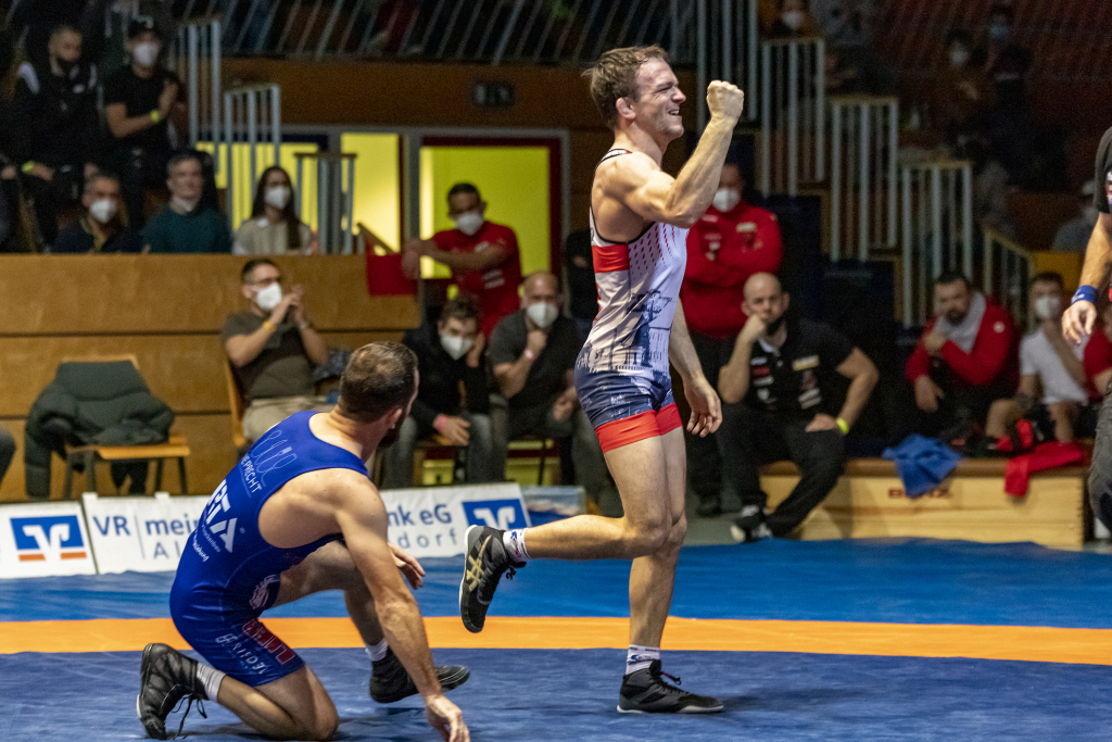 Dabei zog Devils-Trainer Patrick Nuding alle Register, holte 8-Punkte-Ringer Avtandil Kentchadze (80 kg/FR) in die Mannschaft, ‚opferte‘ dafür das Papiergewicht, wo der junge Lucas Wolf (57 kg/FR) bereits nach 18 Sekunden von Burghausens Givi Davidovi auf beide Schultern gedrückt wurde. Im Schwergewicht standen sich zwei Bronzemedaillengewinner der Europameisterschaften 2021 gegenüber, der für Burghausen kämpfende Nikoloz Kakhelashvili (130 kg/GR) bekam in Runde zwei den letzten Punkt zugesprochen und gewann damit beim 1:1 nach Ablauf der sechsminütigen Kampfzeit gegen den deutschen Olympiateilnehmer von Tokio 202One Eduard Popp, der seine Gewichtsvorteile gegen den 23 Kilo leichteren Italiener nicht in Punkte ummünzen konnte.