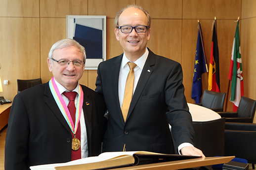 Landtagspräsident André Kuper (r.) mit Pasquale Passarelli im Empfangsraum des Landtags Nordrhein-Westfalen