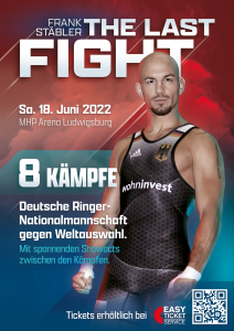Der dreimalige Ringer-Weltmeister Frank Stäbler tritt im Juni 2022 zu seinem letzten Kampf an. Der Olympia Bronze-Medaillengewinner von Tokio beendet mit der Veranstaltung „The Last Fight“ offiziell seine Karriere und stellt im Rahmen eines großen Kampfabends mit herausragenden Show Acts am Samstag, 18. Juni 2022 ab 19 Uhr in der MHP-Arena in Ludwigsburg endgültig seine Schuhe auf der Ringermatte ab.